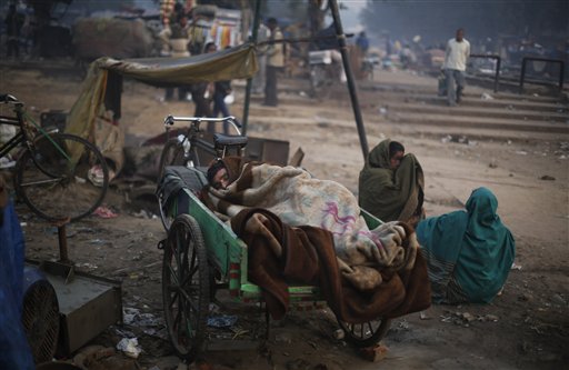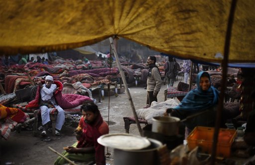 All’alba di New Delhi centinaia di senzatetto aprono gli occhi: la sveglia è “suonata” mentre riposavano nei loro lettini, materassi e coperte affittati ogni giorno a 63 centesimi americani. Dopo la notte all’aperto, una sciacquata in una pubblica fontana e la colazione con quello che si trova. Poi si trascorre la giornata in cerca di un lavoro. Il guadagno? Almeno quei 63 centesimi per sfidare il freddo della prossima notte (foto LaPresse).