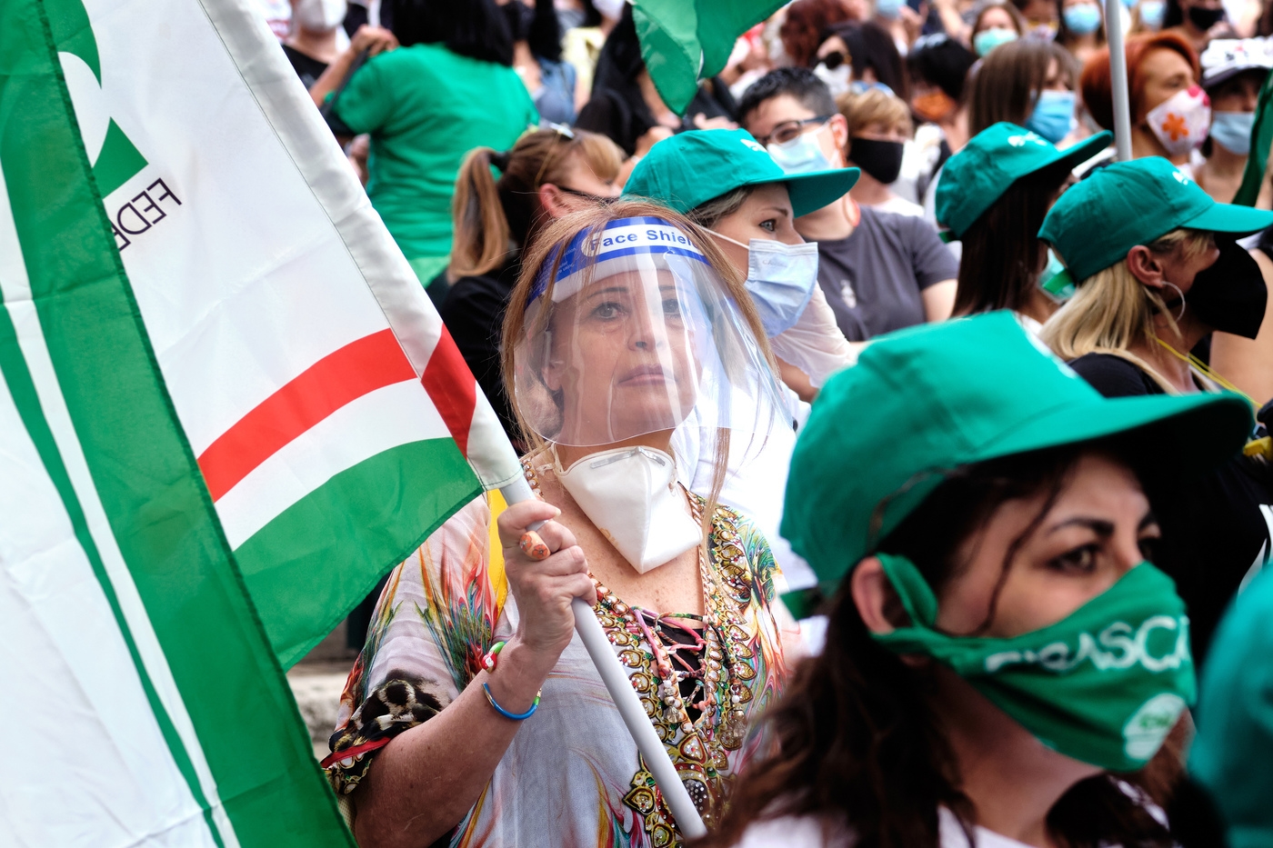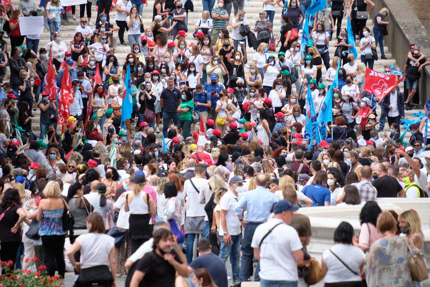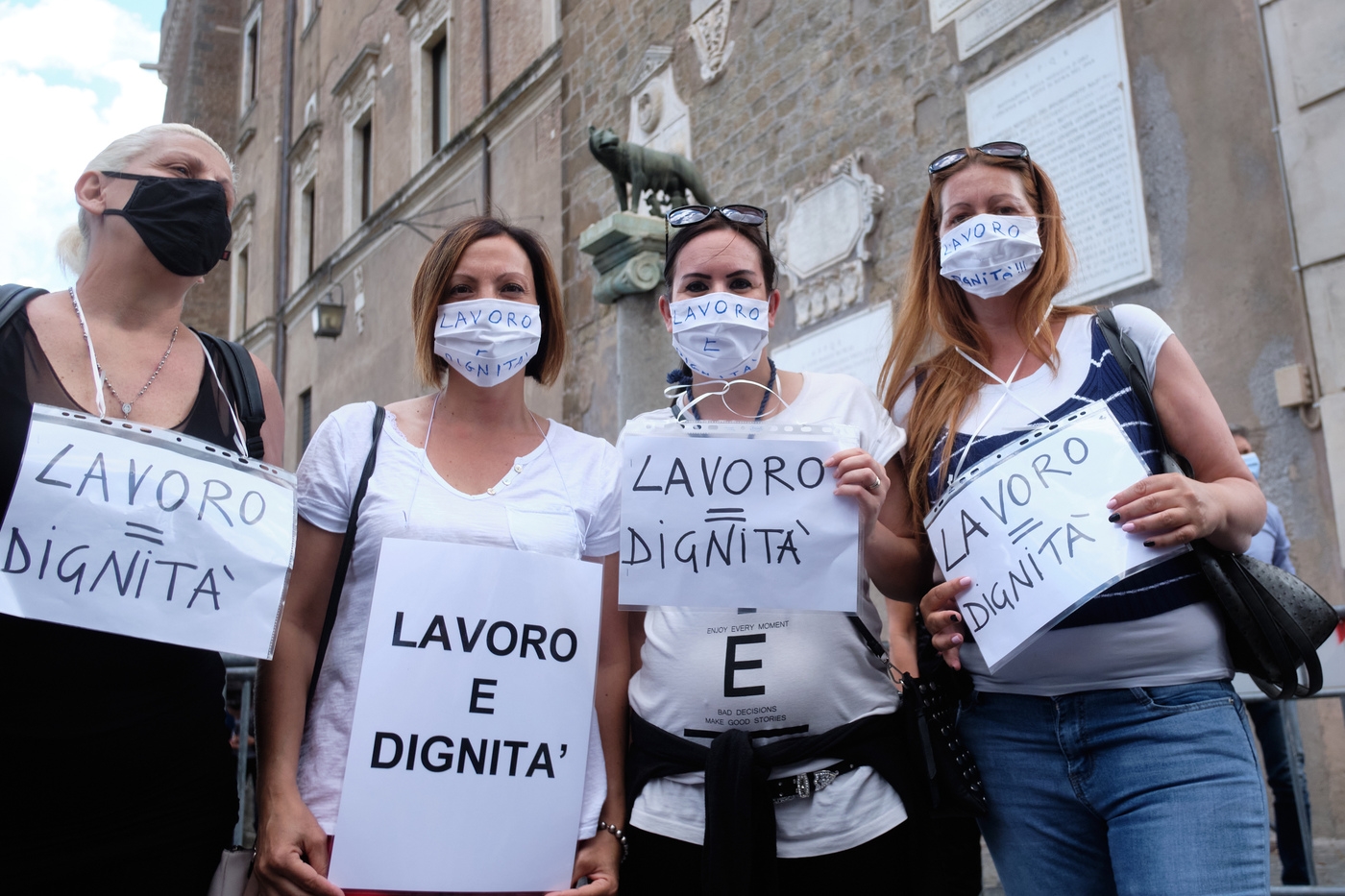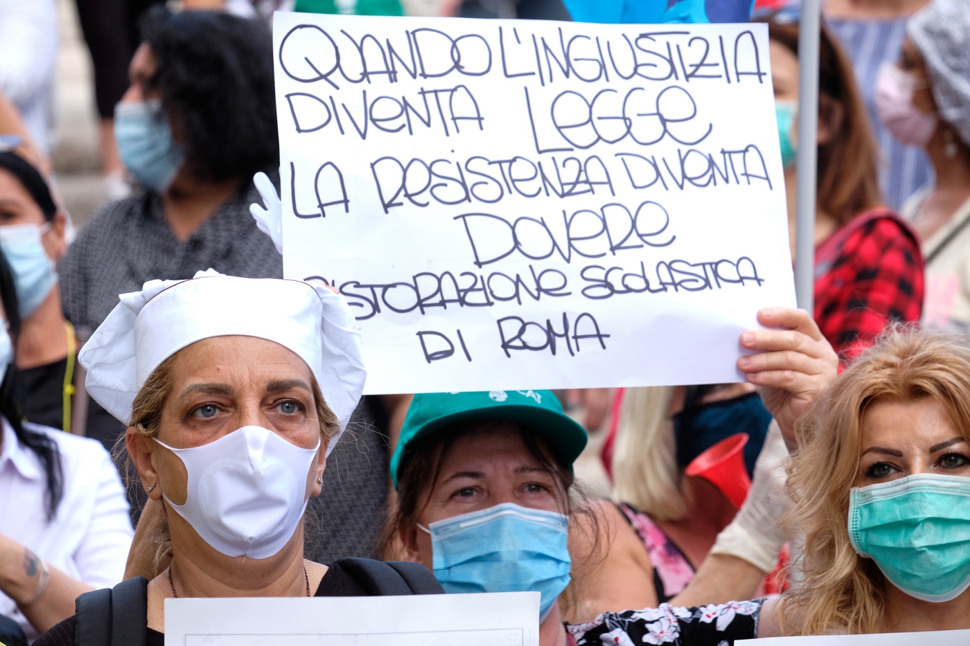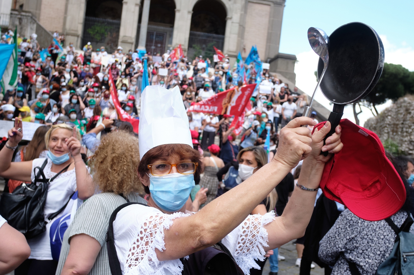 In piazza del Campidoglio si sono radunati, ieri 26 maggio, centinaia di operatori di mense e pulizie delle scuole di Roma chiedendo stipendi, oltre a certezza del lavoro e dignità. Hanno sfidato il divieto di assembramento secondo il principio per cui dignità e salute hanno lo stesso valore. Purtroppo le richieste dei sindacati di far loro svolgere altre attività utili, a partire dalle sanificazioni, finora non sono state accolte dalla giunta Raggi e troppi lavoratori sono senza stipendio da 2 mesi. (foto Lapresse)
