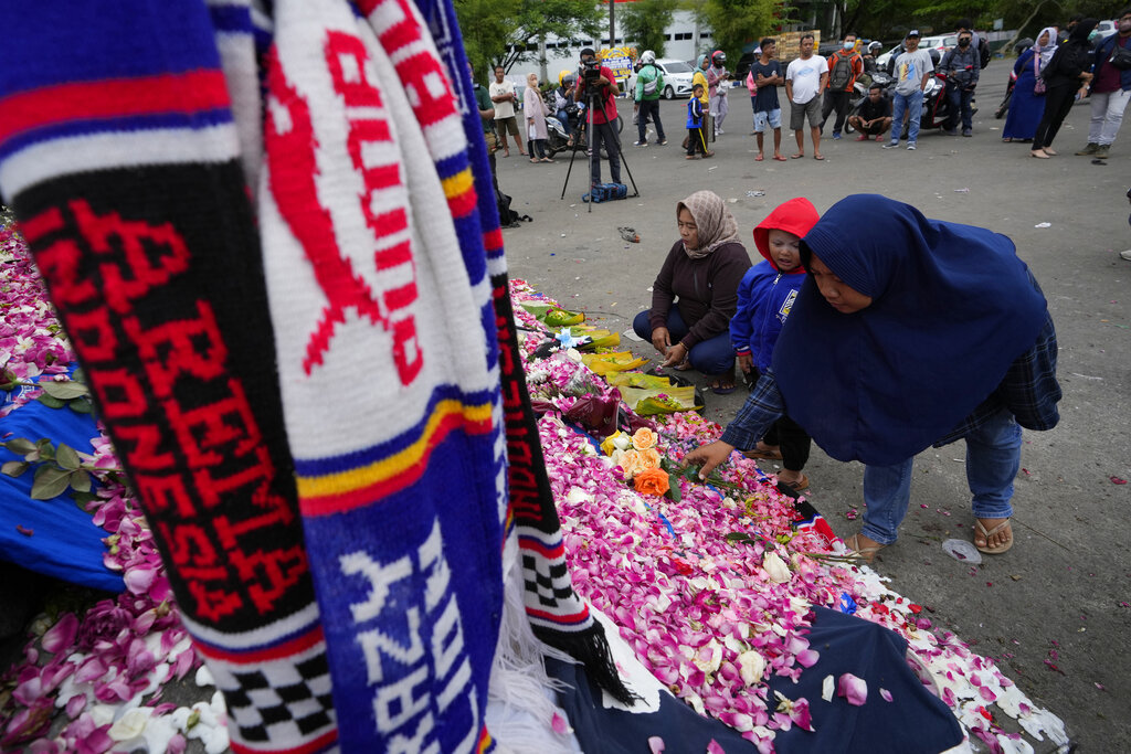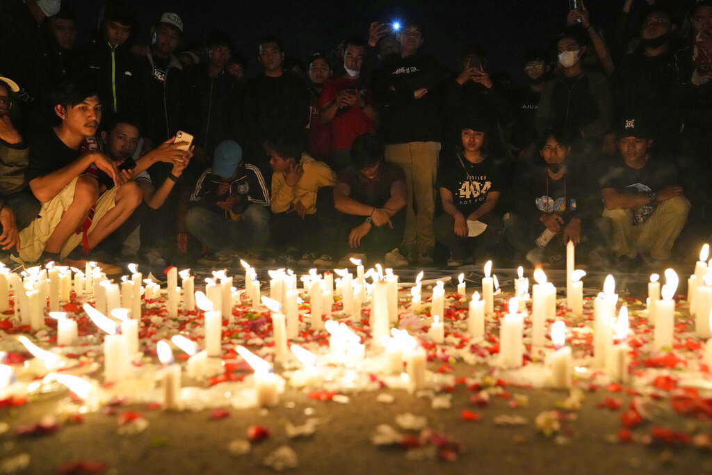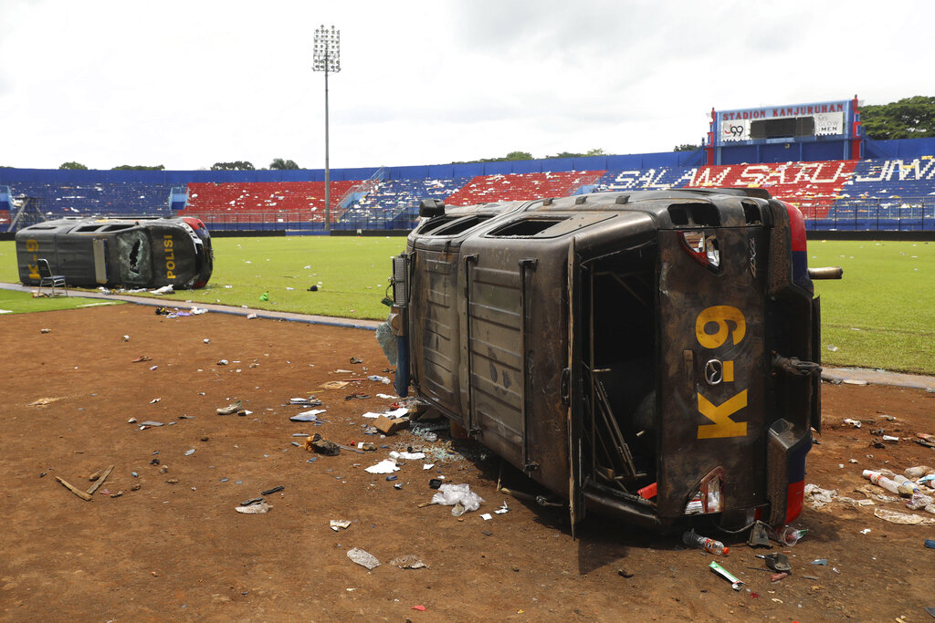 Sono morte calpestate nella calca molte delle vittime – al momento se ne contano 125 secondo il vicegovernatore della provincia di East Java, Emil Dardak intervistato dall’emittente indonesiana Kompas TV – dell’invasione di campo che si è trasformata in tragedia a Malang, nella provincia di Giava Orientale, in Indonesia. I tifosi avevano fatto irruzione in campo al termine dell’incontro, quando la polizia ha lanciato gas lacrimogeni provocando caos e panico tra la folla. Molte persone sono rimaste schiacciate nella ressa mentre cercavano di scappare. La partita di calcio era di Liga 1, la massima serie indonesiana, ed era finita 3 a 2 per la squadra ospite del Persebaya Surabaya. Al Kanjuruhan Stadium c’erano 4mila persone in più del dovuto. (Foto: Ap)