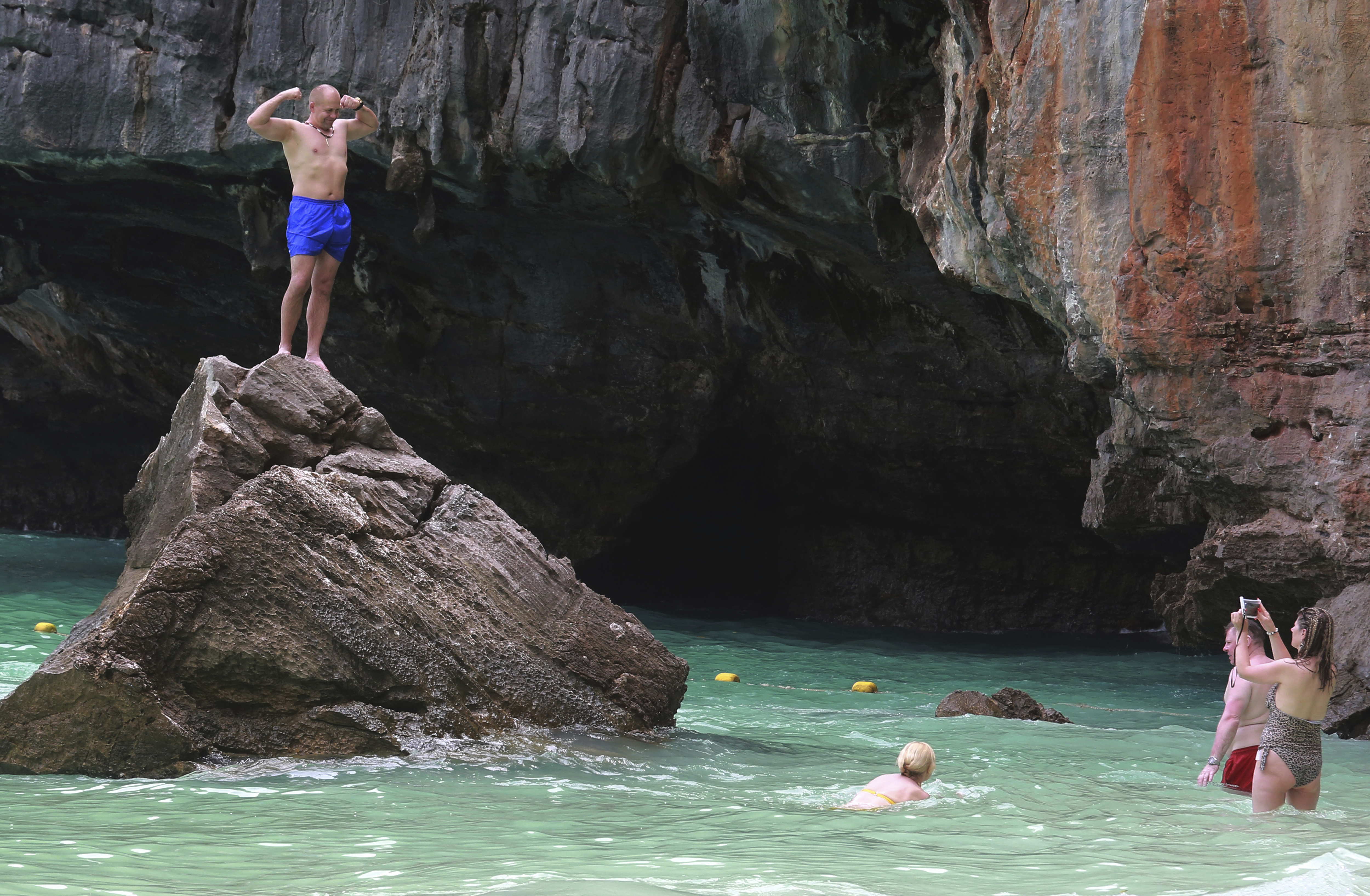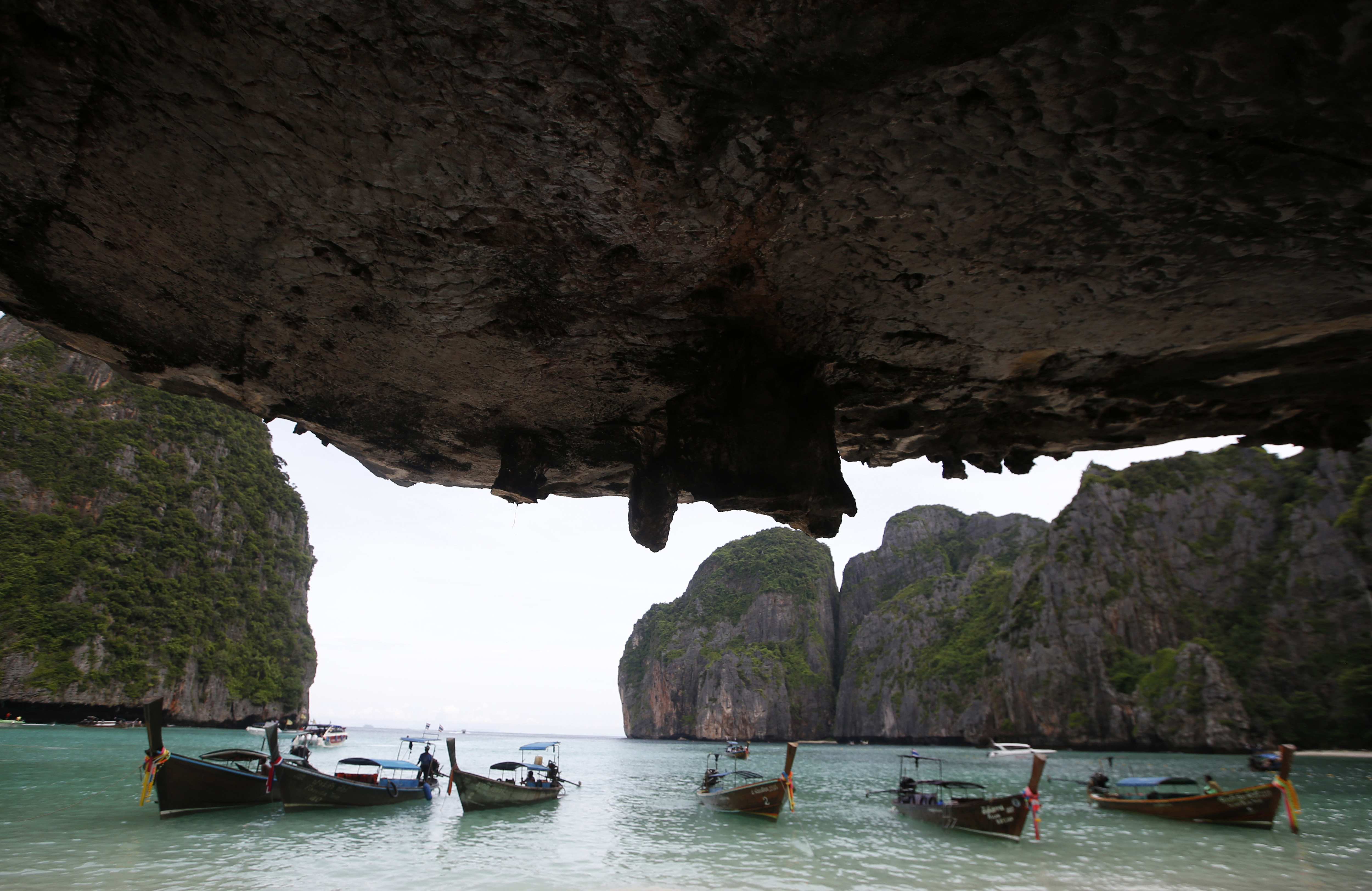 La spiaggia di Maya Bay nel mare delle Andamane, famosa meta turistica nella provincia di Krabi in Thailandia, verrà chiusa ai visitatori per quattro mesi, in modo da permettere alle barriere coralline e alla vita in mare di riprendersi dall’assalto del turismo di massa iniziato quasi due decenni fa. (AP Photo / Sakchai Lalit)