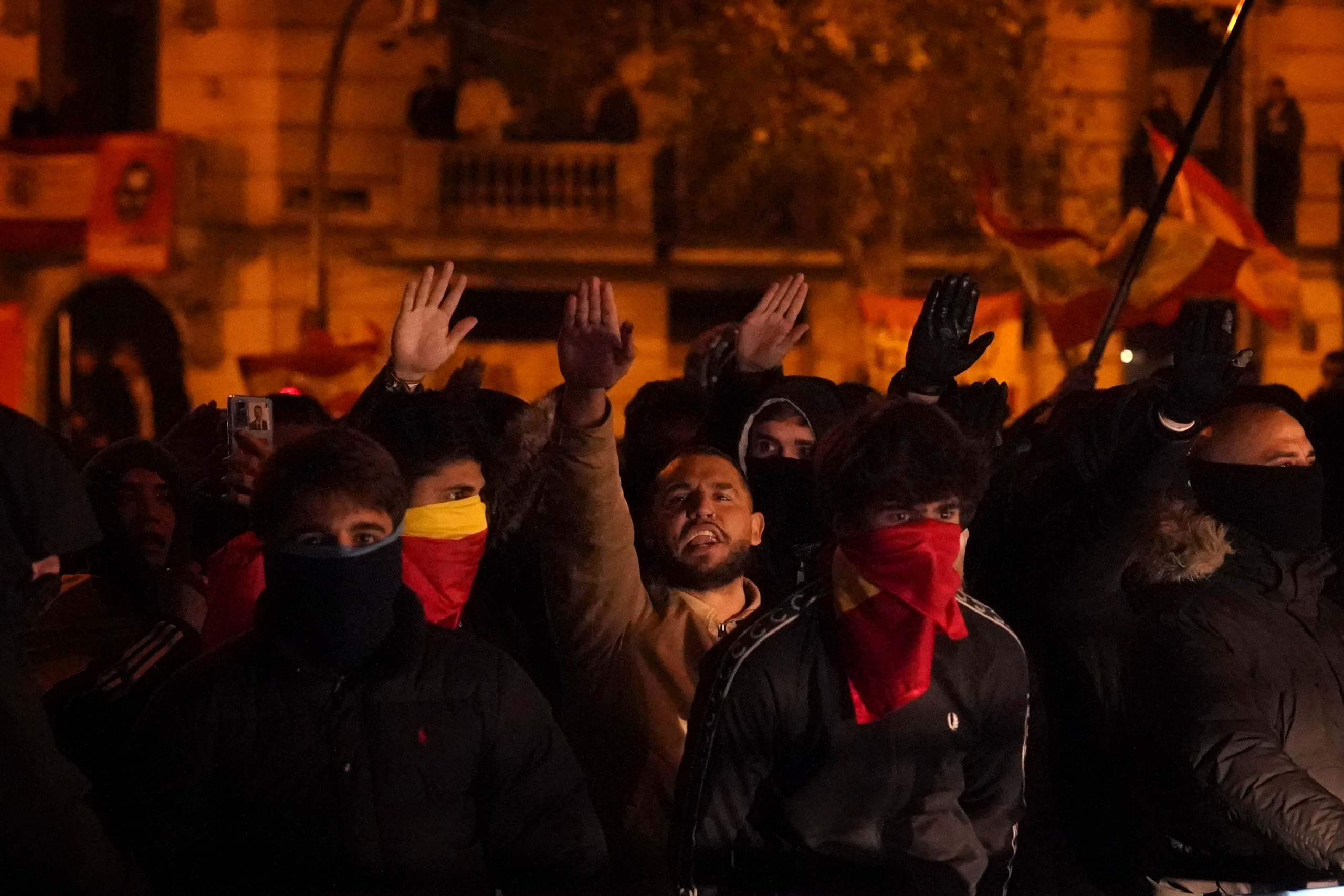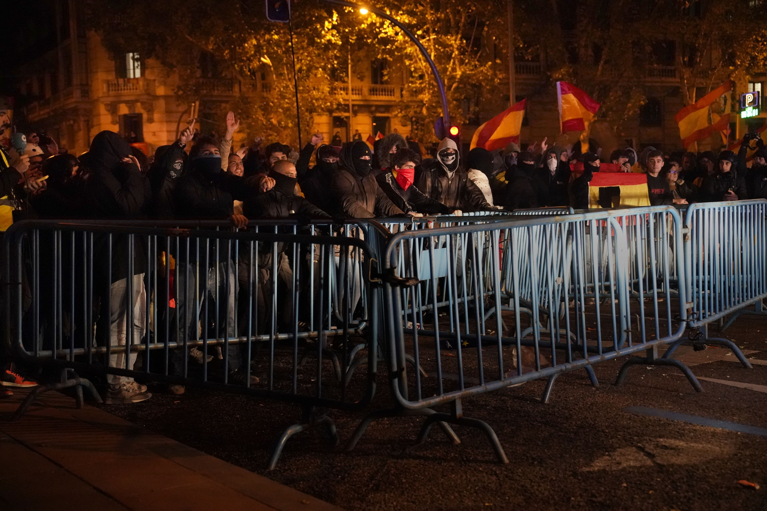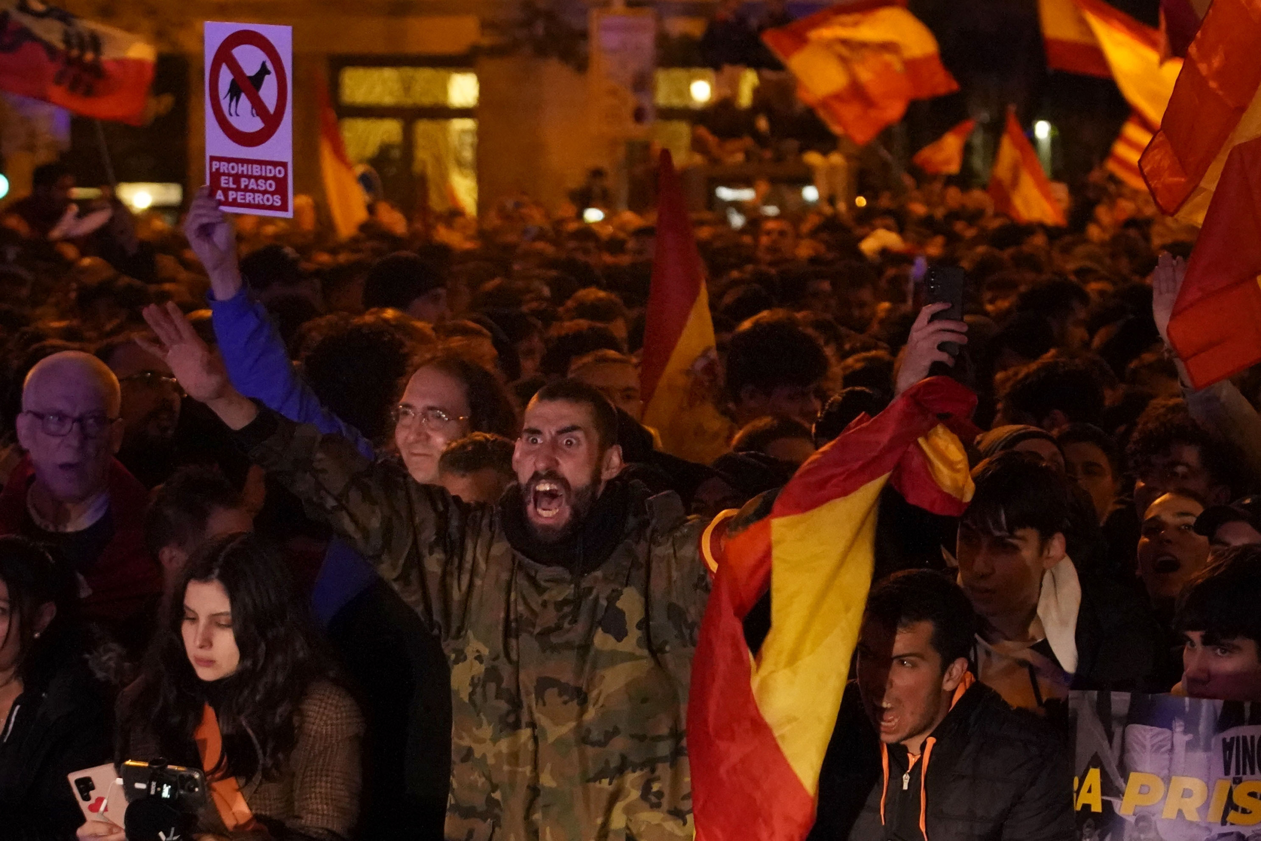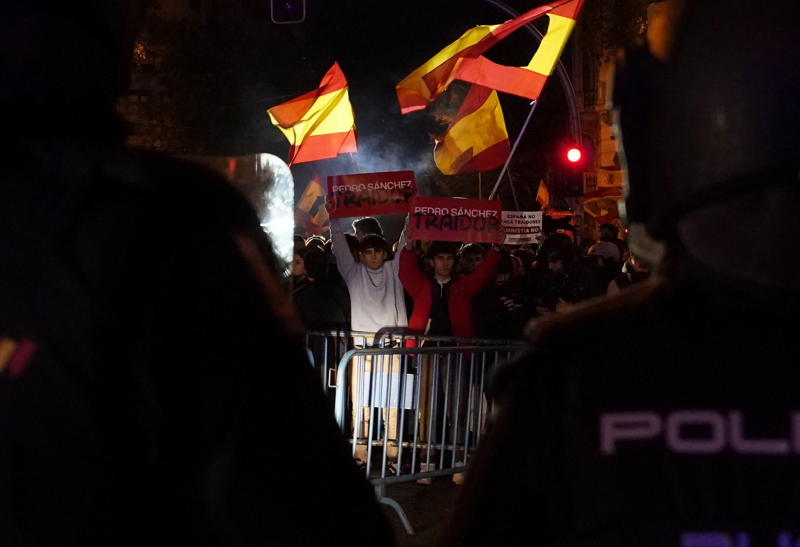 Nel mirino dei manifestanti, diretti contro la sede del partito socialista (Psoe) in calle Ferraz, la proposta di amnistia per i dirigenti della Catalogna coinvolti nel fallito tentativo di secessione del 2017, una delle condizioni poste dai deputati catalani separatisti per garantire i loro voti al governo del premier uscente Pedro Sanchez che, altrimenti, non avrà una maggioranza. Appunto per avere il loro sostegno, Sanchez sta negoziando su questo punto con i catalani. (AP Photo/Andrea Comas)