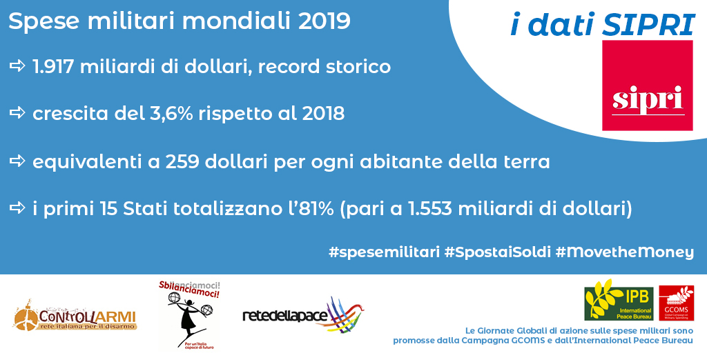 L’Istituto Internazionale di Ricerca per la Pace di Stoccolma, Sipri, ha reso pubblici i dati aggiornati sulle spese militari riferiti al 2019 registrando un aumento del 3,6% rispetto al 2018 con una cifra record di 1.917 miliardi di dollari (259 dollari per ogni abitante della terra)