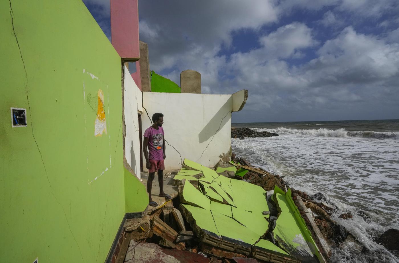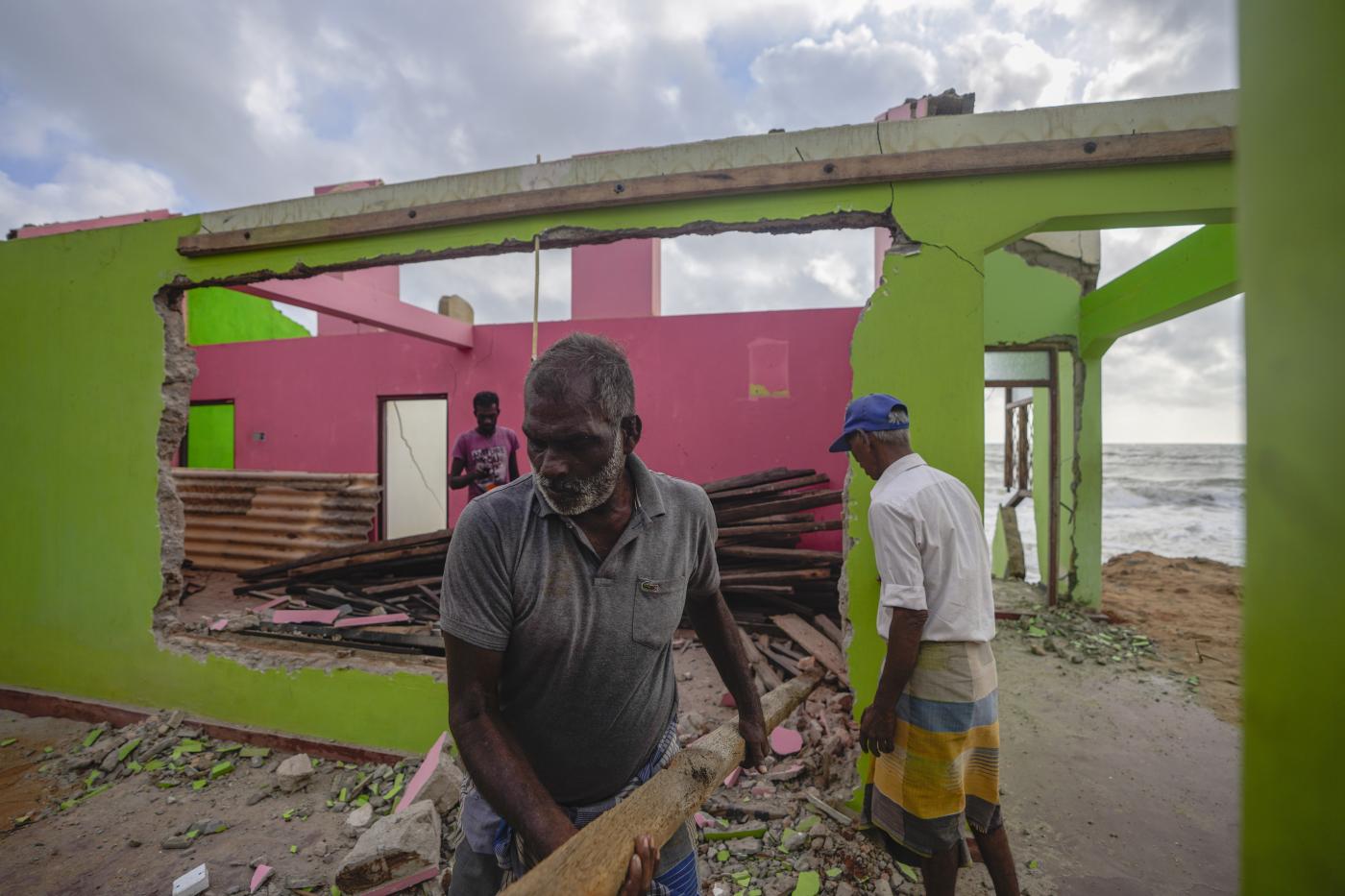 Nelle foto le drammatiche immagini del villaggio di Iranwilla, nel nord ovest del Paese: pescherecci attraccati mentre un uomo lancia una rete da pesca vicino a una duna di sabbia, un uomo guarda l’oceano seduto accanto alle macerie della sua casa di famiglia distrutta dall’erosione, un altro, colpito dalla stessa sorte, cerca oggetti recuperabili nella sua casa distrutta dall’erosione, recuperando ciò che può dal relitto di quella che una volta era la sua abitazione: travi di sostegno in legno, sezioni di tetto e altri materiali da costruzione per costruirne un’altra nell’entroterra. (Foto AP via LaPresse)