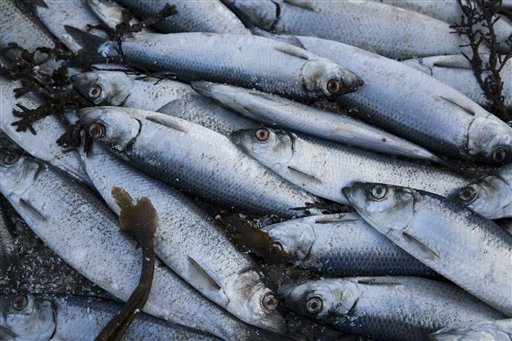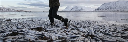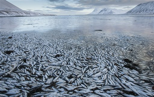 Fiordo di Kolgrafafjordur, Islanda. Milioni di aringhe morte galleggiano nei mari del Nord. L'inquinamento delle acque sembra dovuto a una discarica abusiva nei pressi della zona (foto Ap).