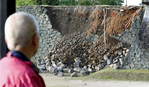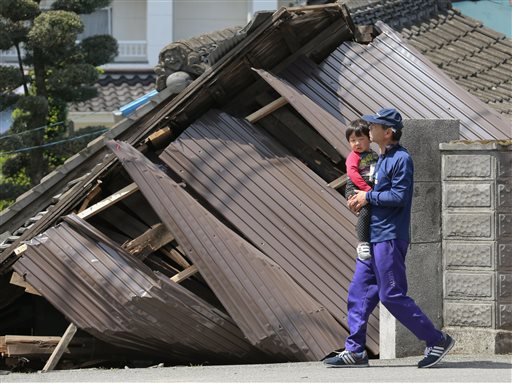 La prefettura di Kumamoto è stata colpita ieri da un sisma di 6.4 gradi. Per ora sono 9 i morti accertati, ma il bilancio tende inevitalbilmente ad aumentare, considerando anche i gravi danni alle case e sono previste altre scosse di assestamento. 500 centri di accoglienza al momento riuniscono circa 44 mila persone e più di mille agenti di polizia coordinano le manovra di assistenza. (foto Ap)