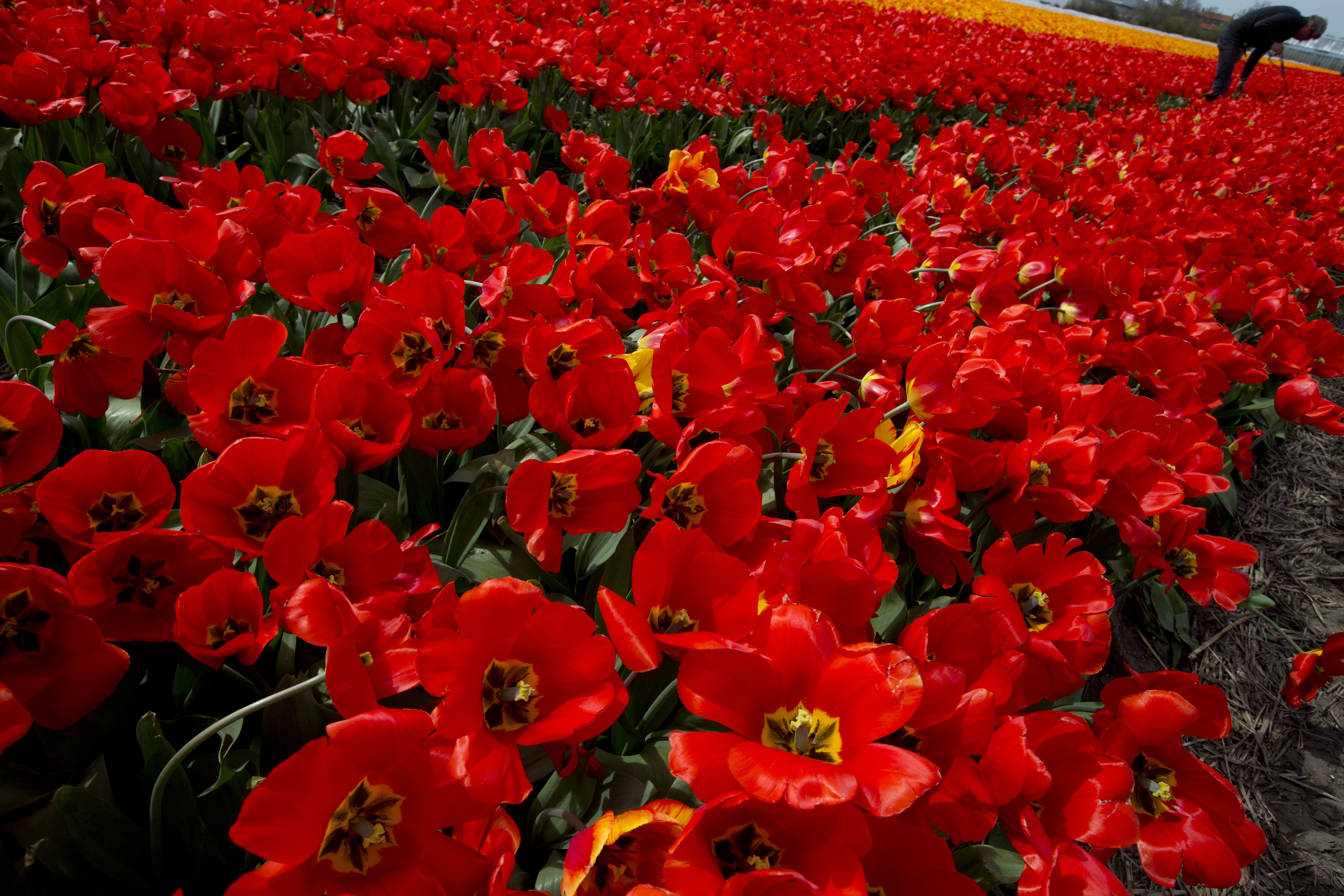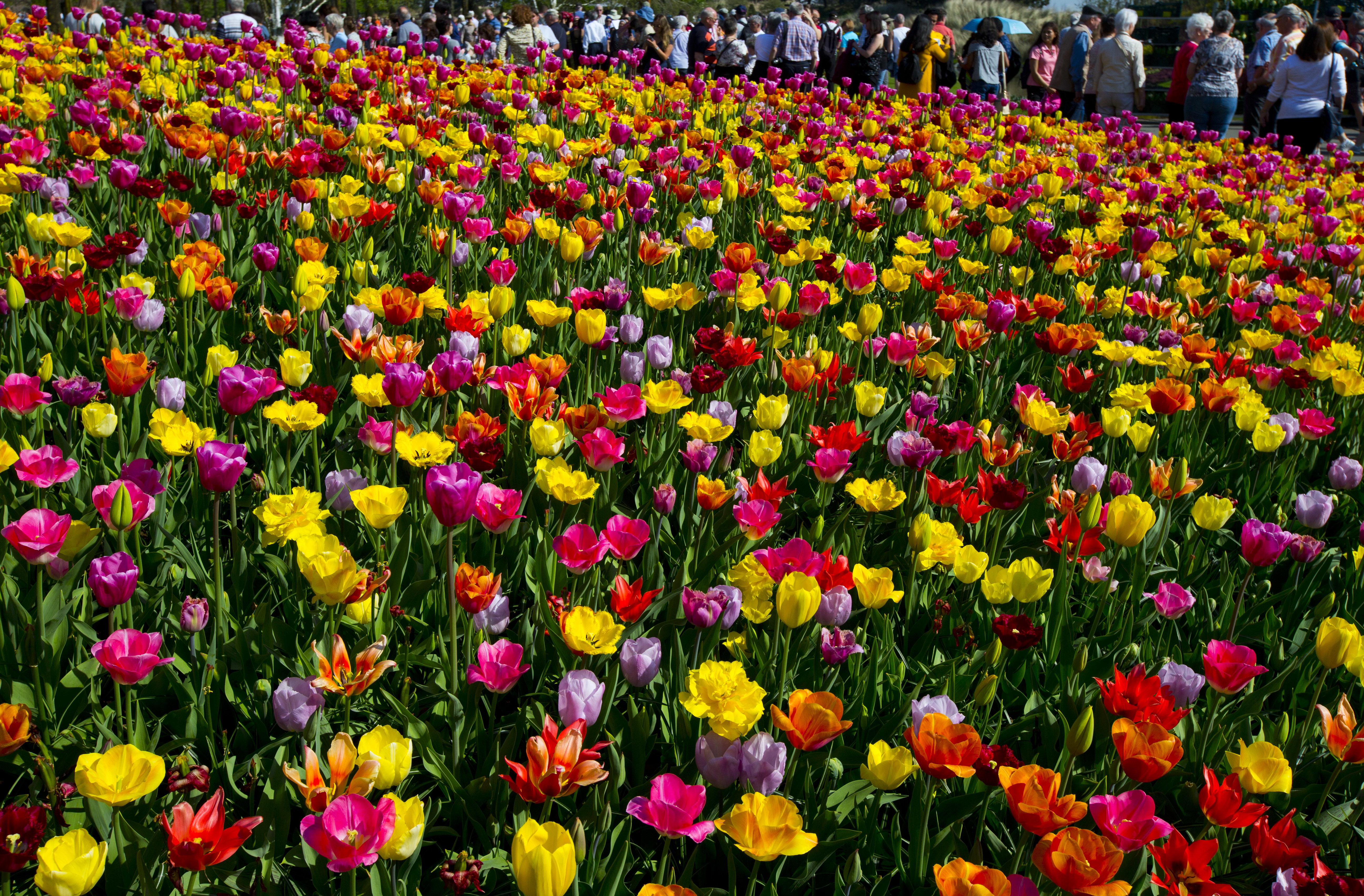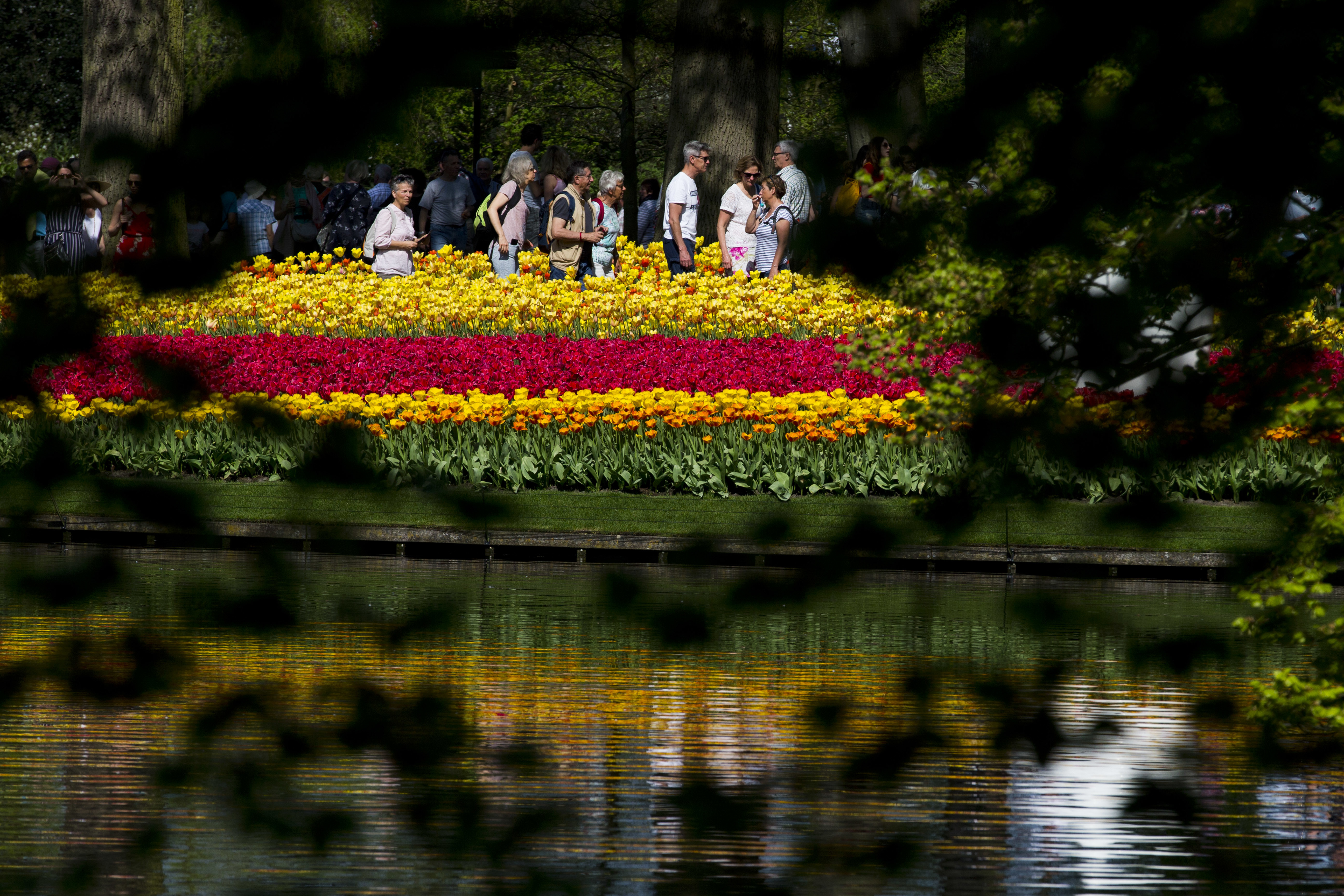 Turisti visitano il giardino Keukenhof in Lisse in Olanda nella stagione primaverile che vede sbocciare infinite varità di tulipani multicolori. Il giardino Keukenhof sarà aperto fino al prossimo 13 maggio, copre una superficie di 32 ettari con circa 7 milioni di tulipani, narcisi e giacinti e attrae 1 milioni di visitatori da tutto il mondo.