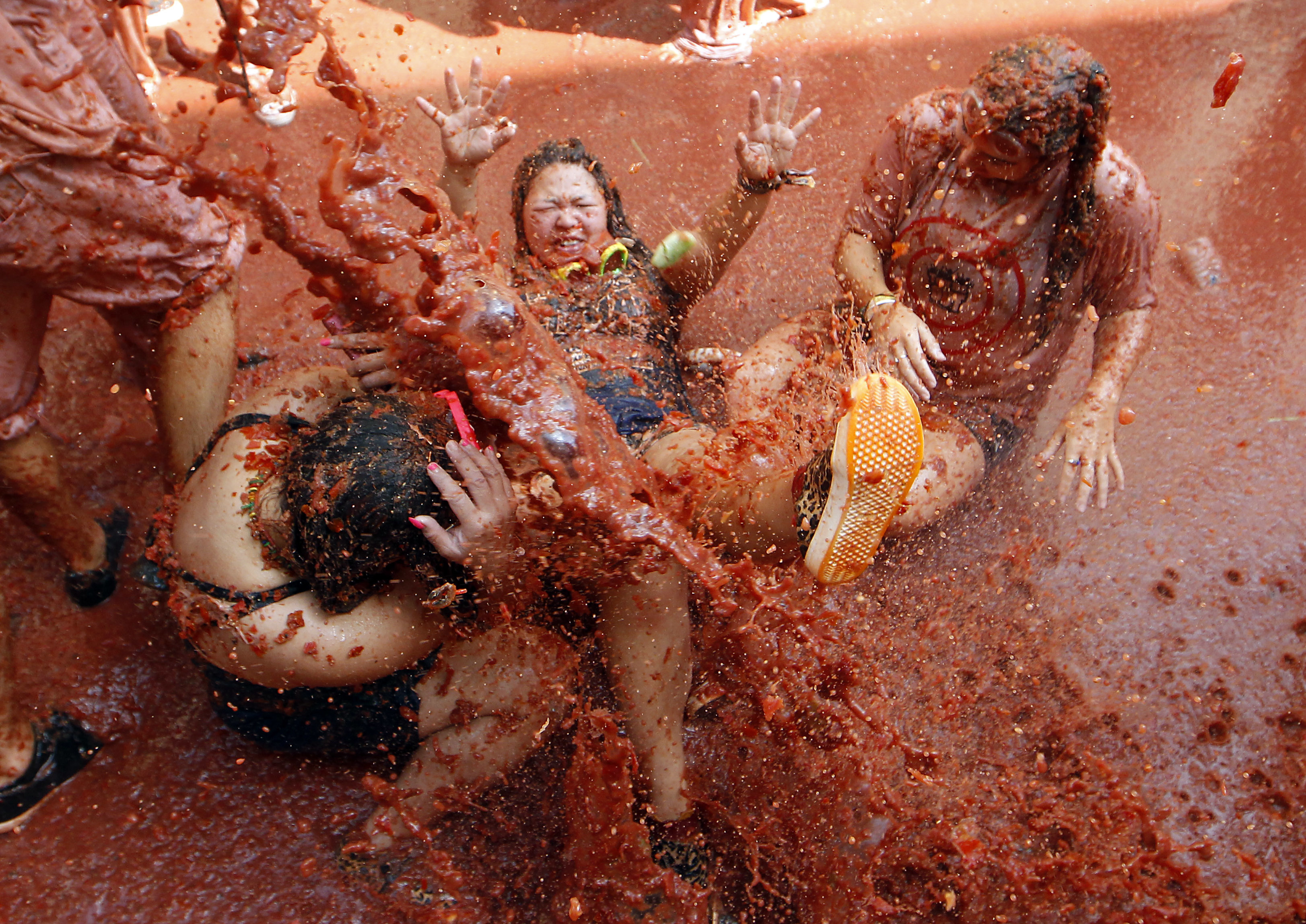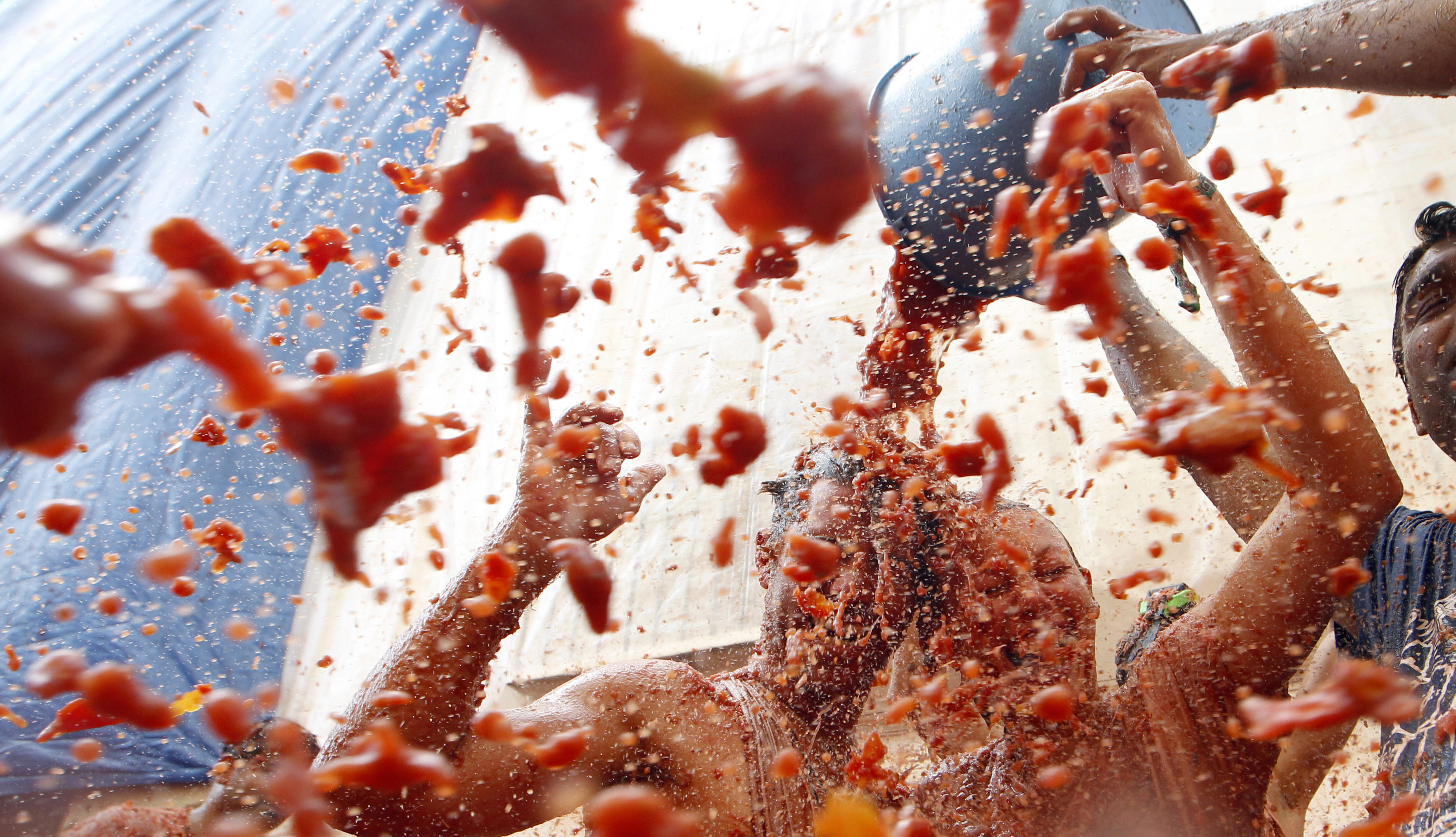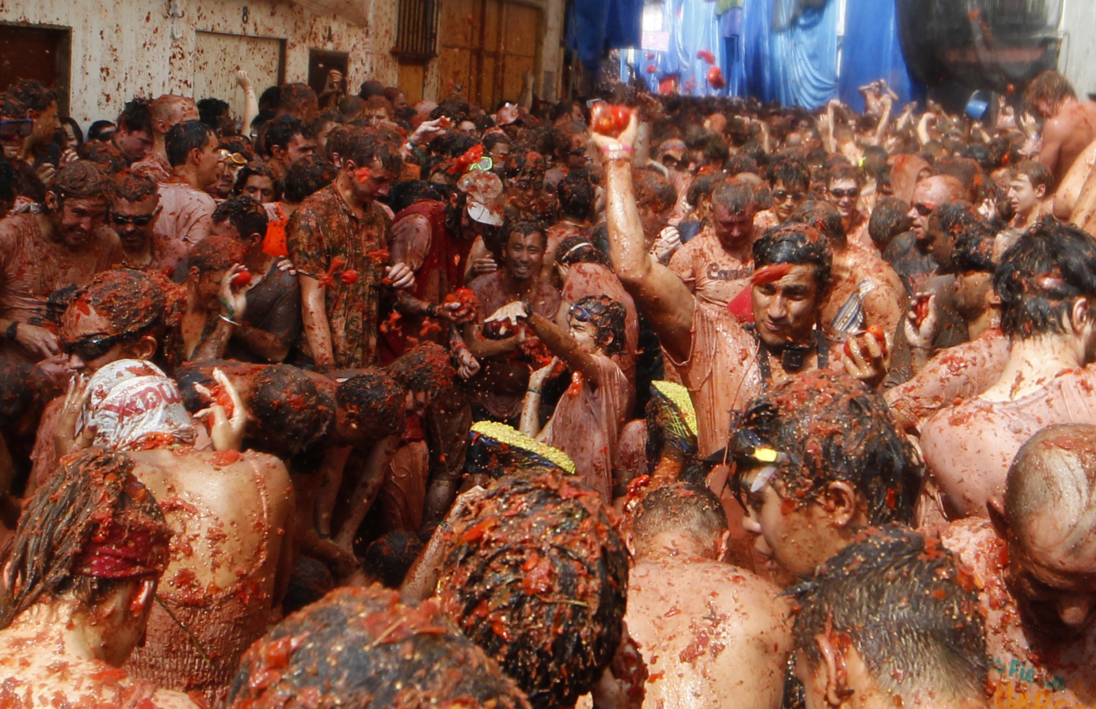 È la battaglia dei pomodori che si tiene ogni anno in Spagna,a Buñol,vicino Valencia. Nata,si dice, nel 1945 , dopo una rissa tra giovani, affonda, in realtà, le sue radici nella festa medievale, con tracce mitologiche, dei Giganti e dei Testoni diffusa specialmente in Europa occidentale e America Latina. Quel rosso assomiglia al sangue e ci ricorda, anche, la competizione commerciale esistente con l’Italia, che ancora detiene il record di produzione ed esportazione, pur con filiere che restano da bonificare. Lo spreco esibito di cibo risponde tuttavia a tradizioni di Paesi abituati all’austerità, come un passaggio liberatorio e caotico. Foto spettacolari di Ap.