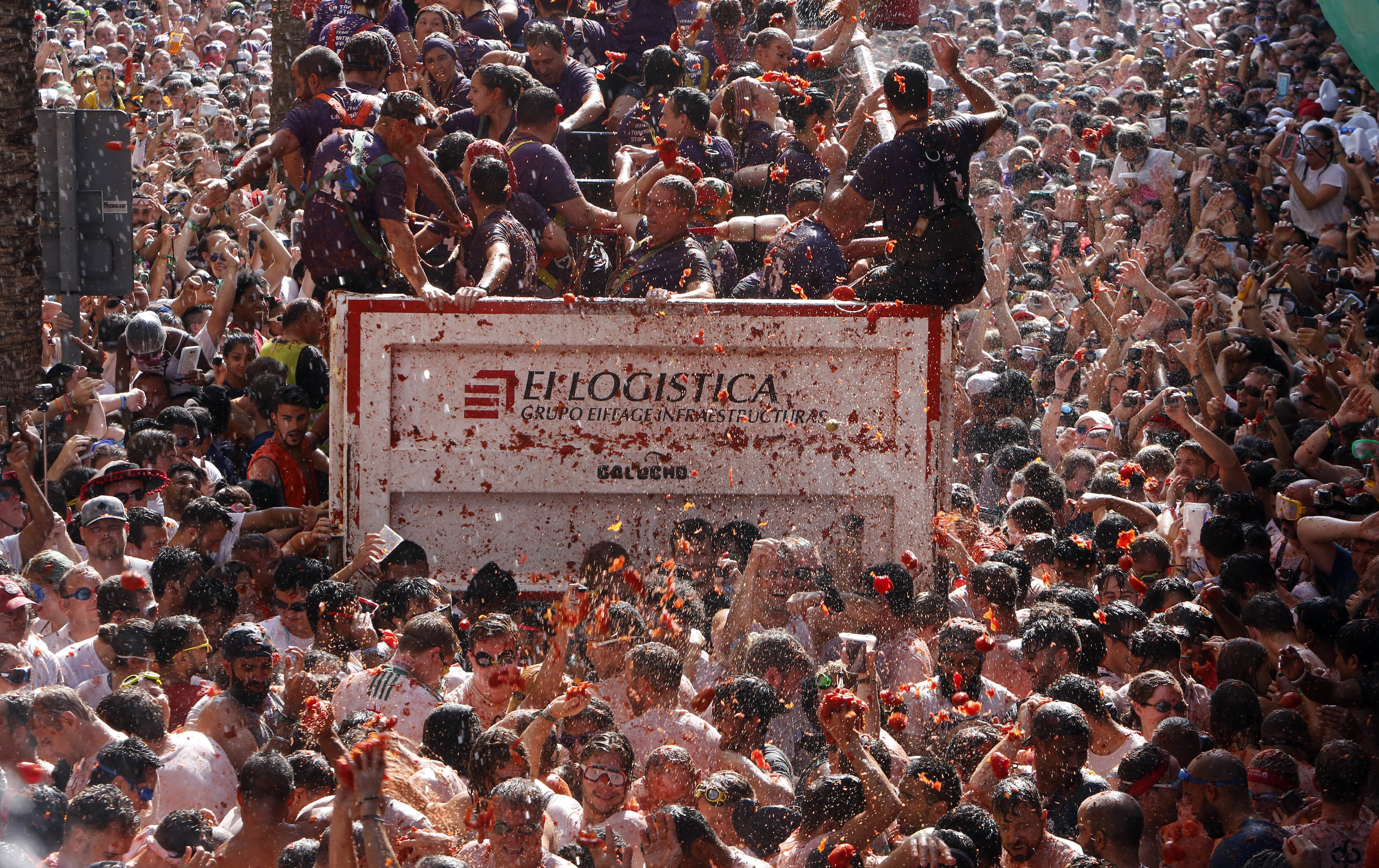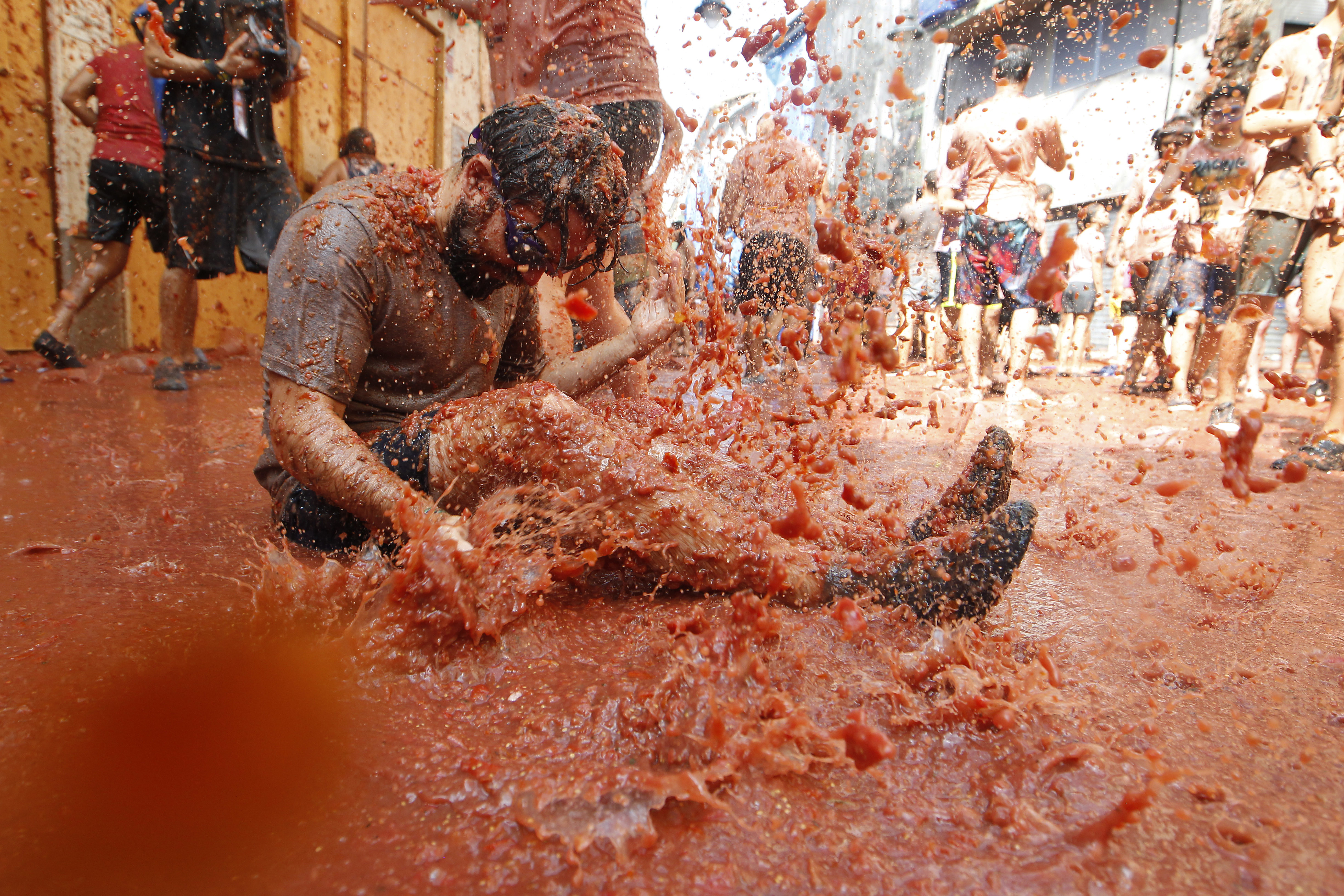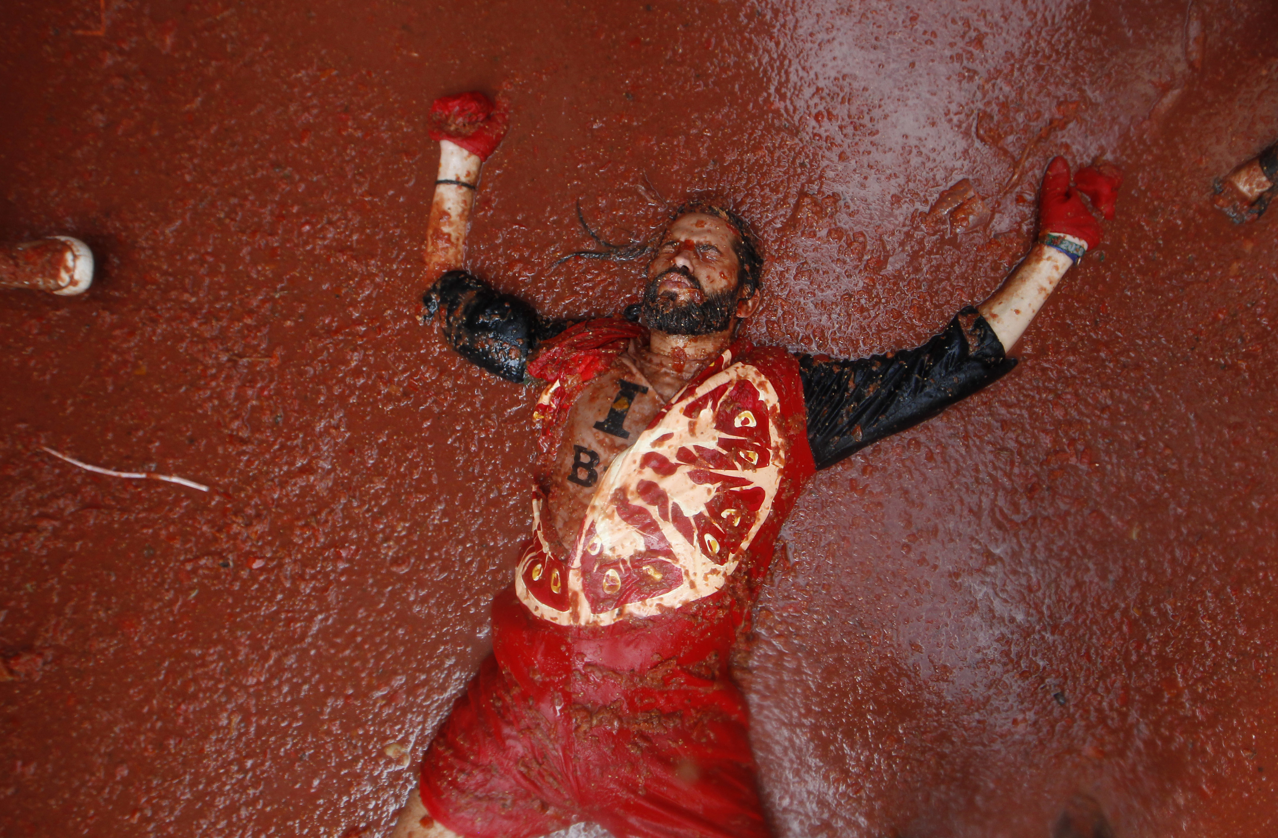 È la battaglia dei pomodori che si tiene ogni anno in Spagna,a Buñol,vicino Valencia. Nata,si dice, nel 1945 , dopo una rissa tra giovani, affonda, in realtà, le sue radici nella festa medievale, con tracce mitologiche, dei Giganti e dei Testoni diffusa specialmente in Europa occidentale e America Latina. Quel rosso assomiglia al sangue e ci ricorda, anche, la competizione commerciale esistente con l’Italia, che ancora detiene il record di produzione ed esportazione, pur con filiere che restano da bonificare. Lo spreco esibito di cibo risponde tuttavia a tradizioni di Paesi abituati all’austerità, come un passaggio liberatorio e caotico. Foto spettacolari di Ap.