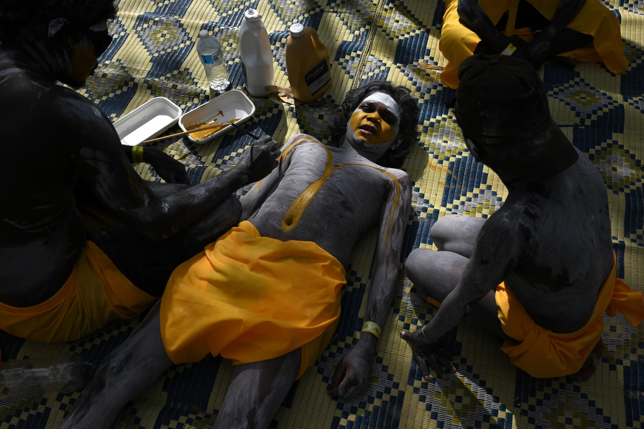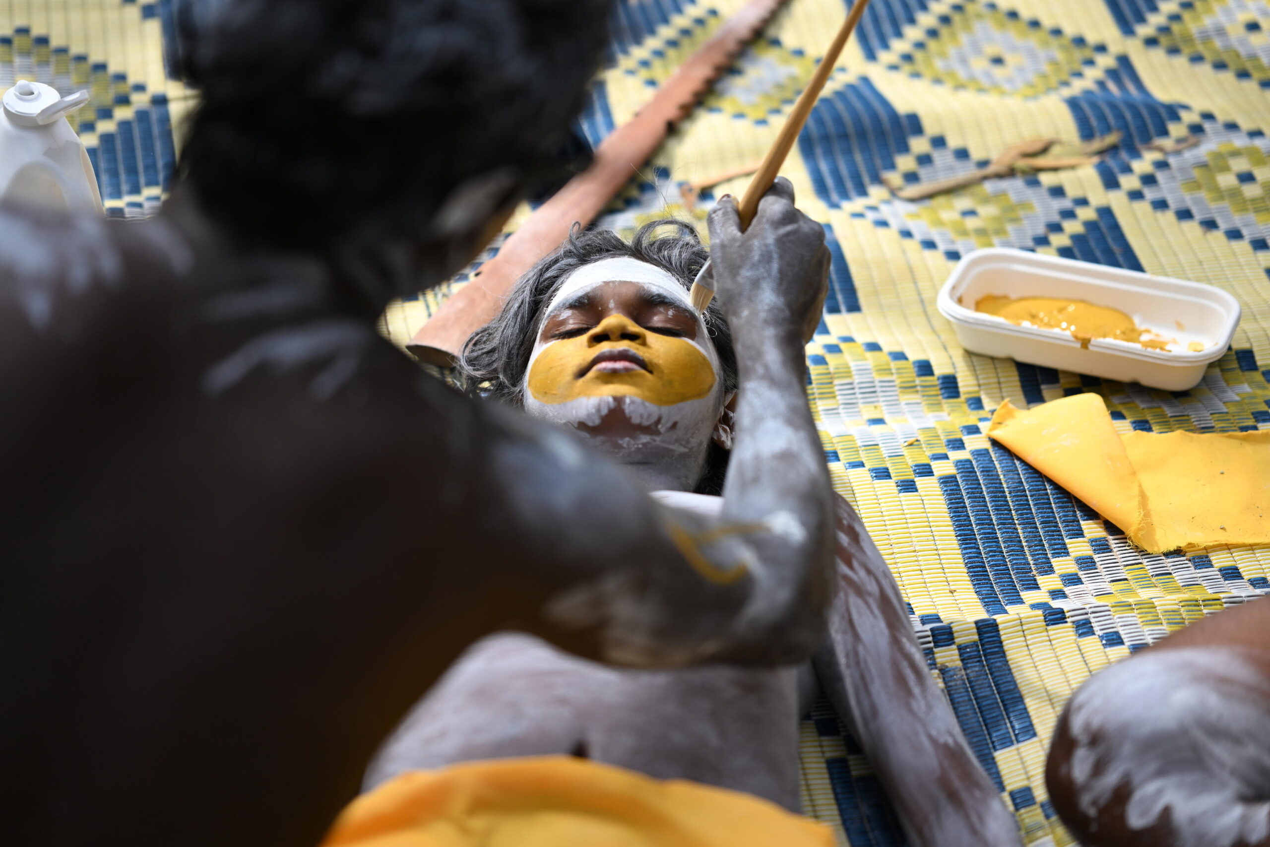 Queste immagini affascinanti e piene di colore si riferiscono nello specifico ad alcuni componenti del clan Gumiatj del popolo Yolngu, mentre si preparano per la danza tradizionale del Bunggul.