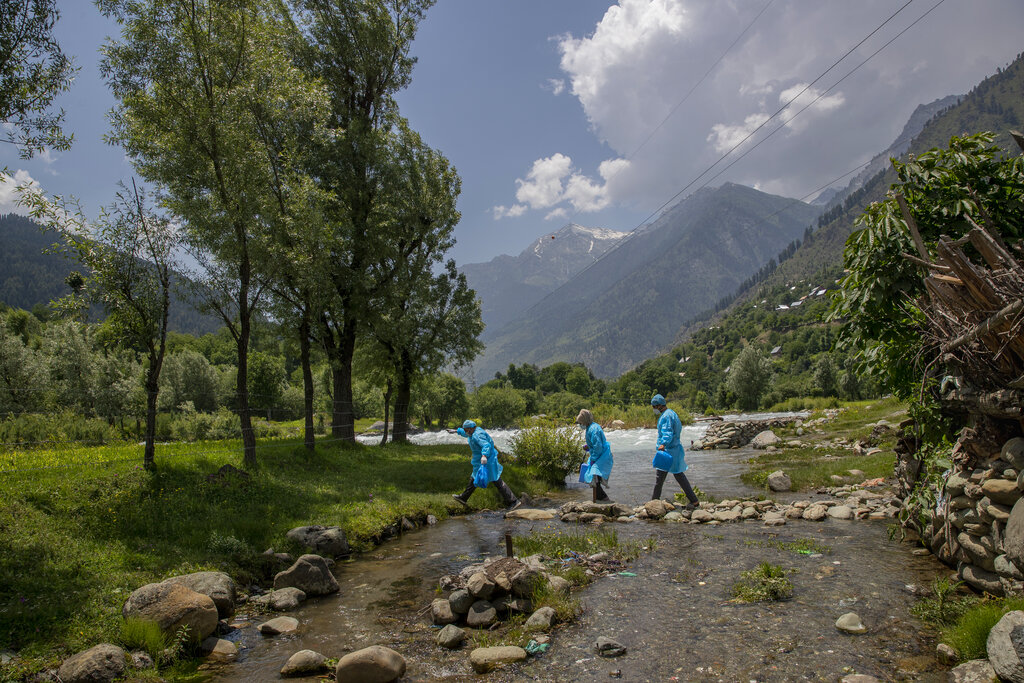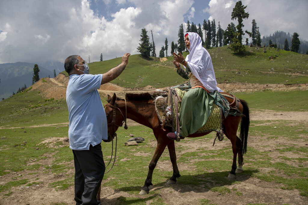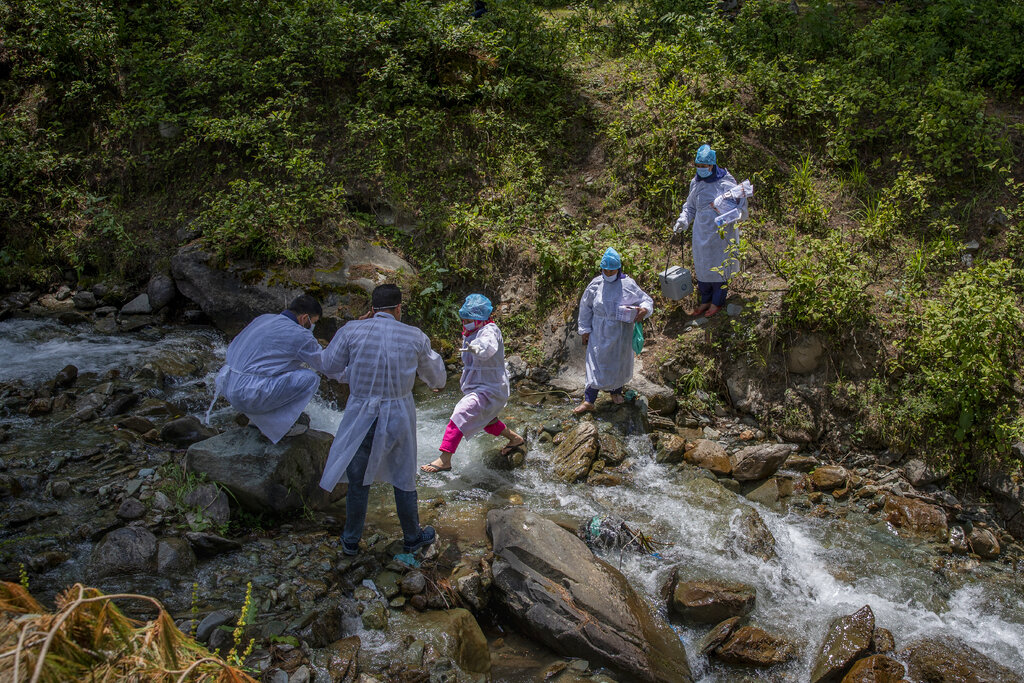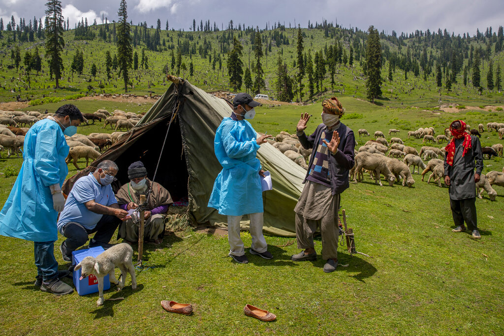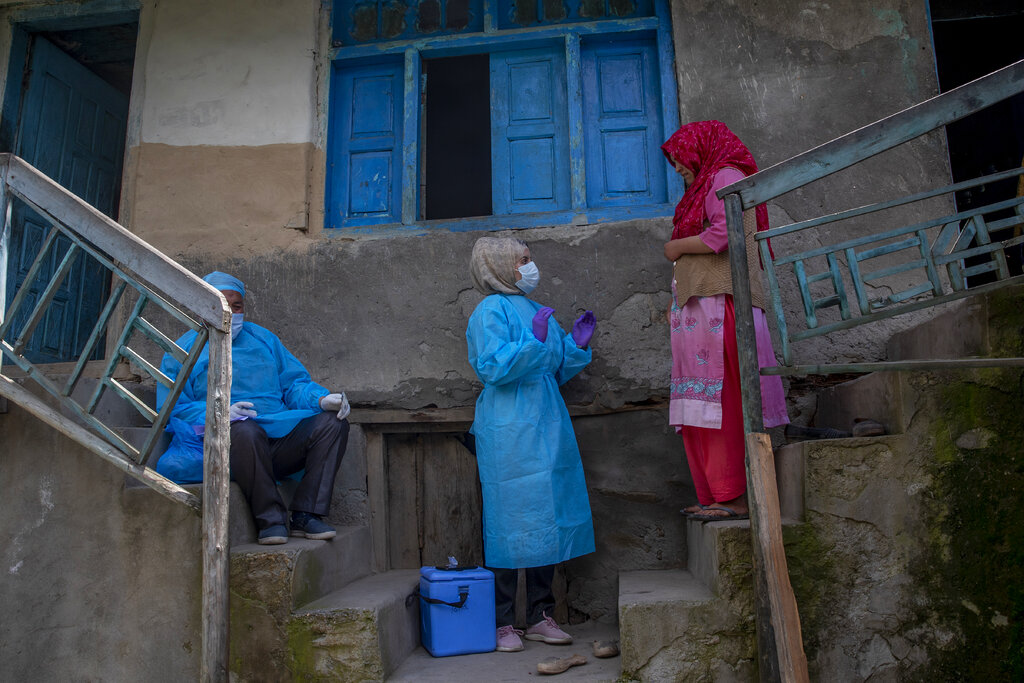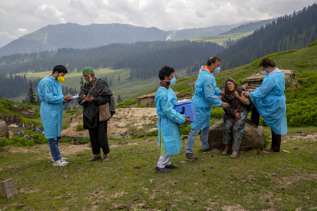 La campagna di vaccinazione in India, uno dei Paesi più colpiti dalla pandemia, va avanti anche nell’impervia regione himalayana del Kashmir. La sfida per gli operatori sanitari che percorrono lunghe distanze per curare i pastori nomadi non è tanto il terreno di montagna, quanto la paura delle donne. A causa della disinformazione, infatti, nelle aree rurali più remote molte persone credono che i vaccini causino impotenza, gravi effetti collaterali e persino la morte. (AP Photo/Dar Yasin)
