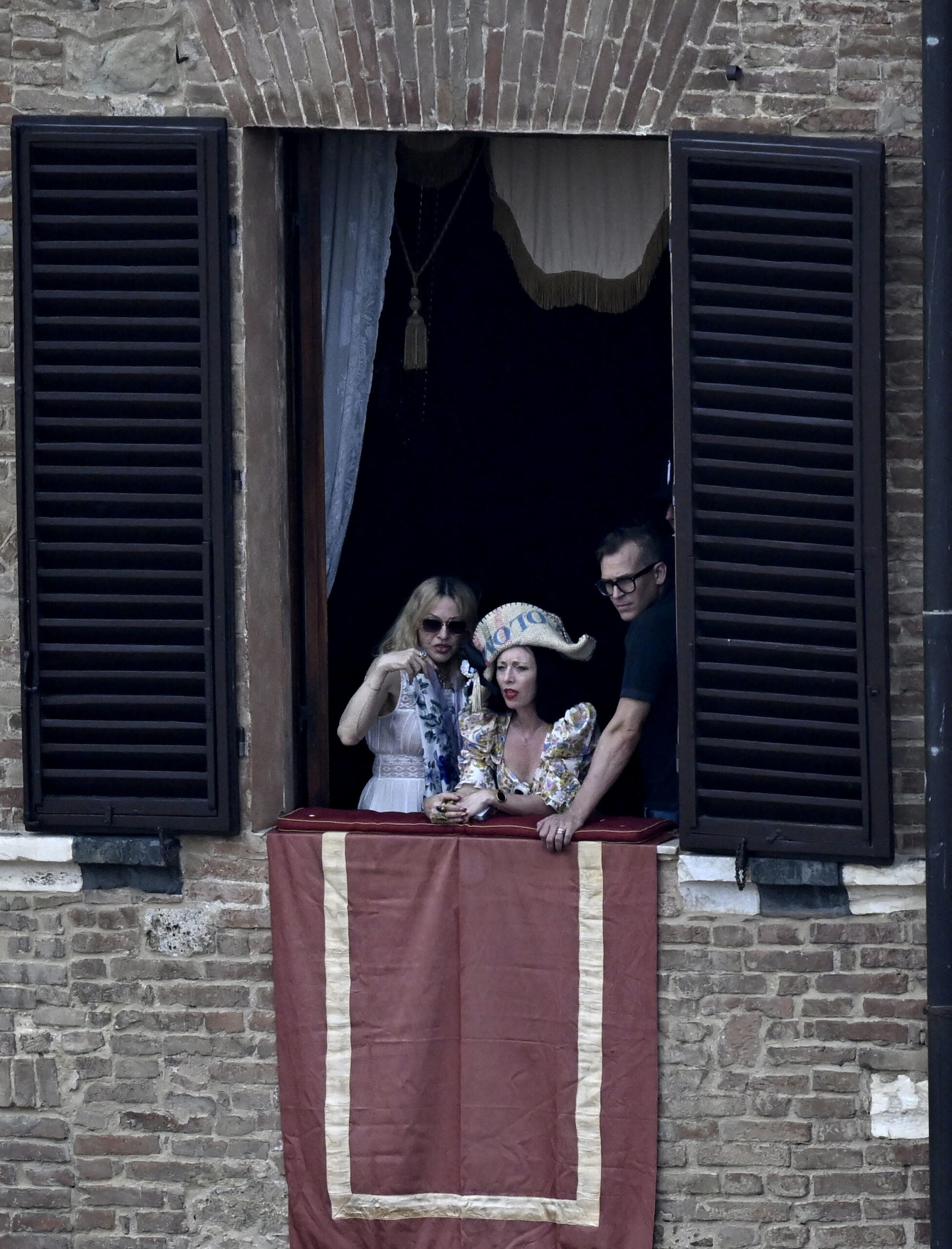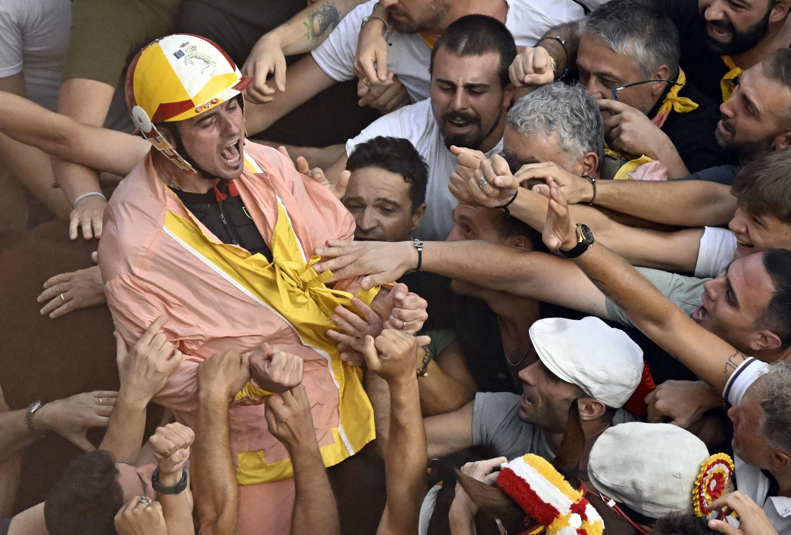Il fantino Giuseppe Zedde, detto Gingillo, esulta per la vittoria al Palio di Siena 2025. Spettatrice d’eccezione la cantante Madonna