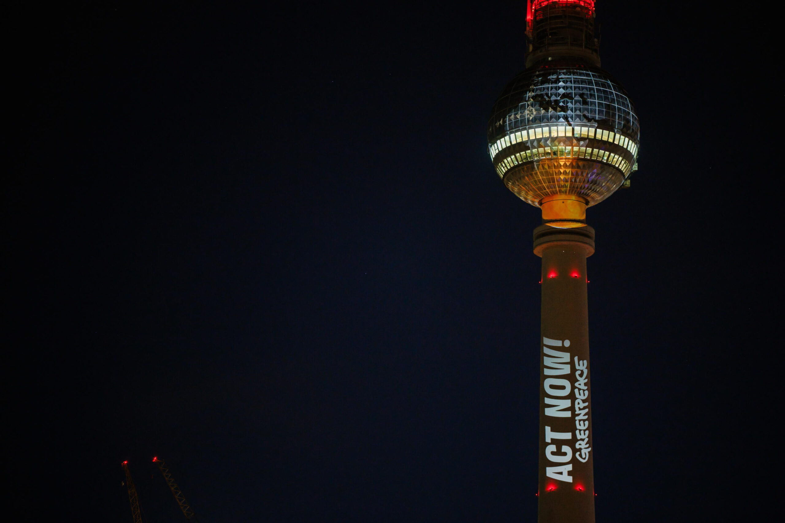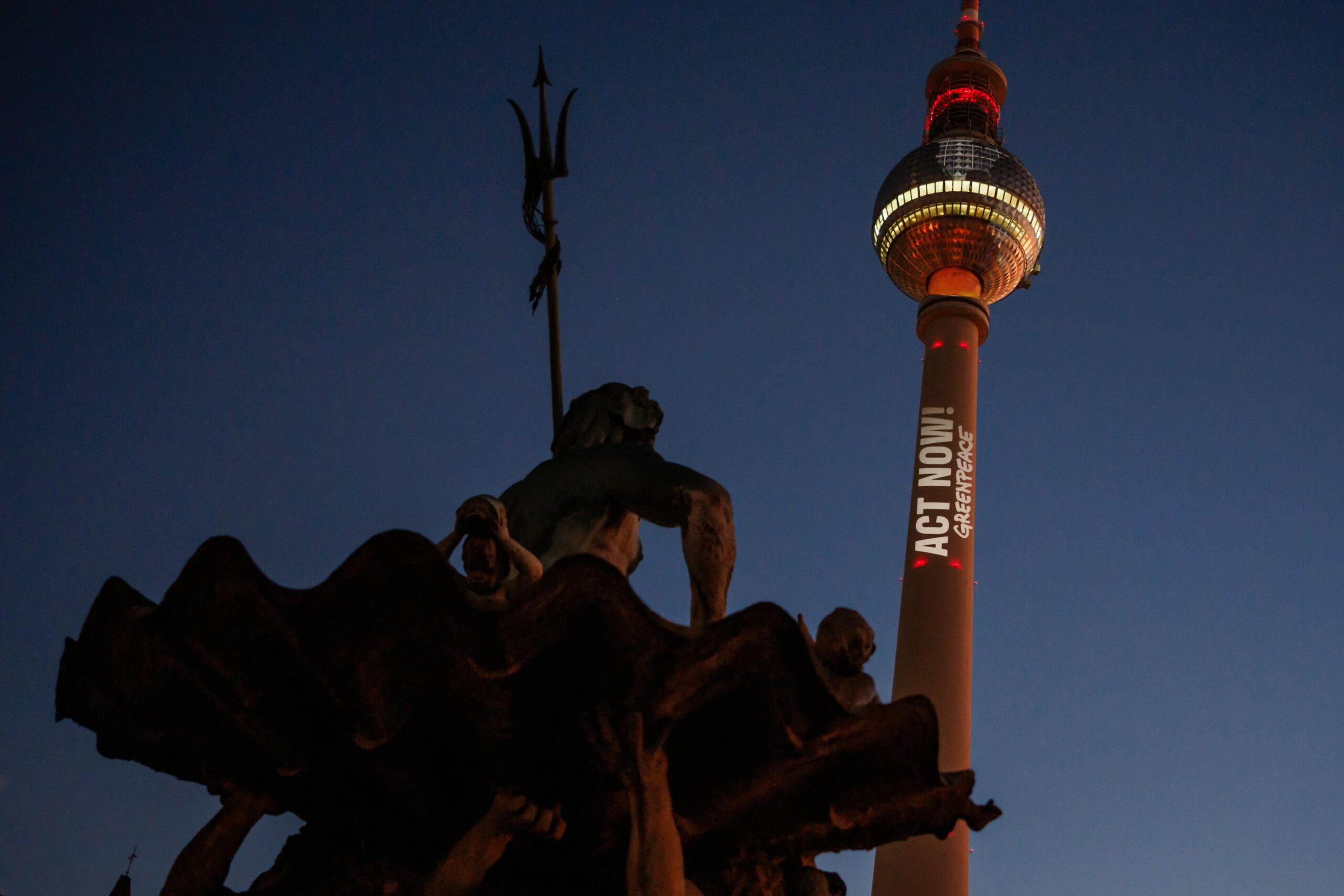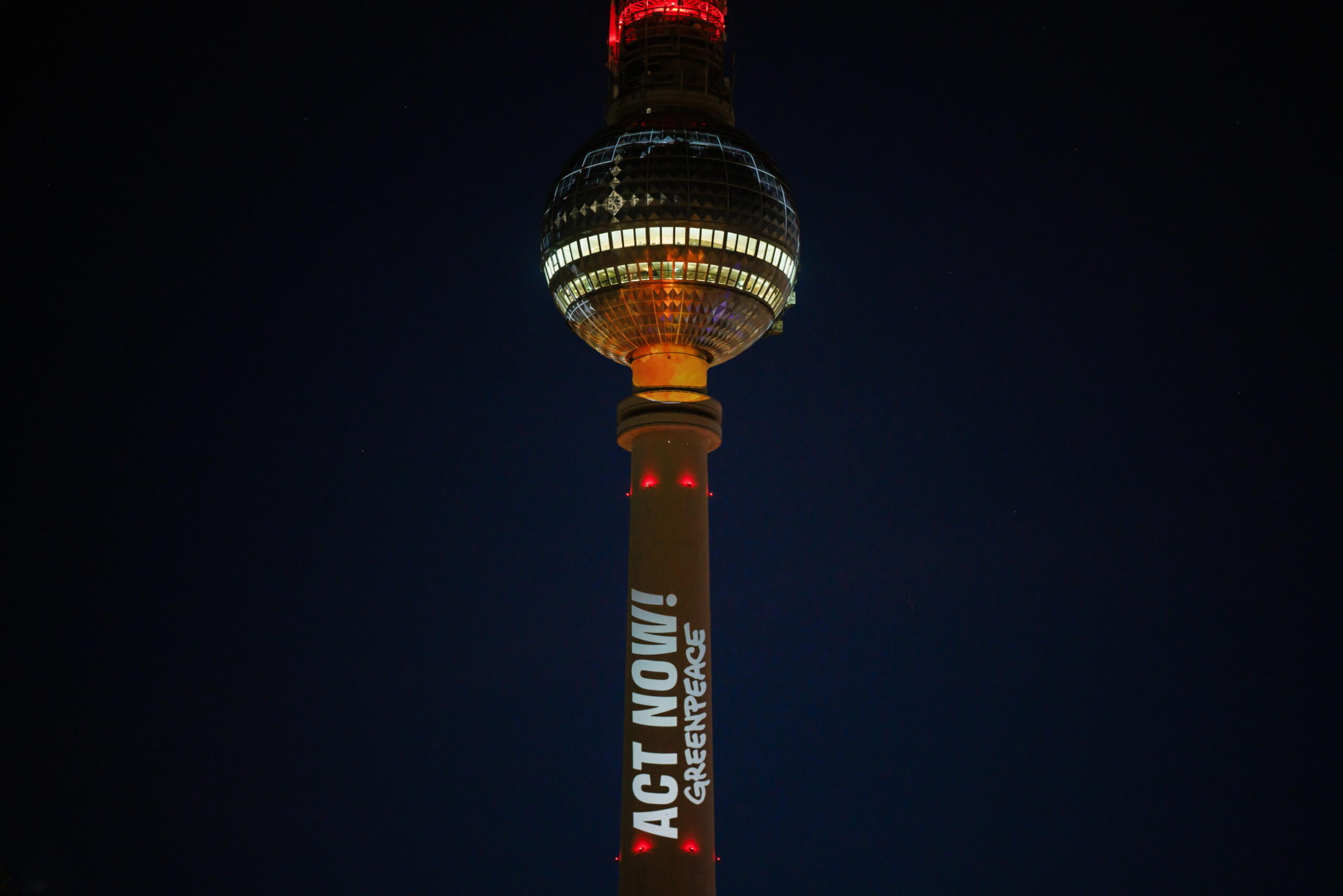 Gli attivisti stanno facendo sentire la loro voce in tutto il mondo: queste foto sono state scattate nella capitale tedesca Berlino, dove, su iniziativa di Greenpeace, la torre della tv è stata illuminata con la scritta “Act now”!, “Agite adesso!”.
