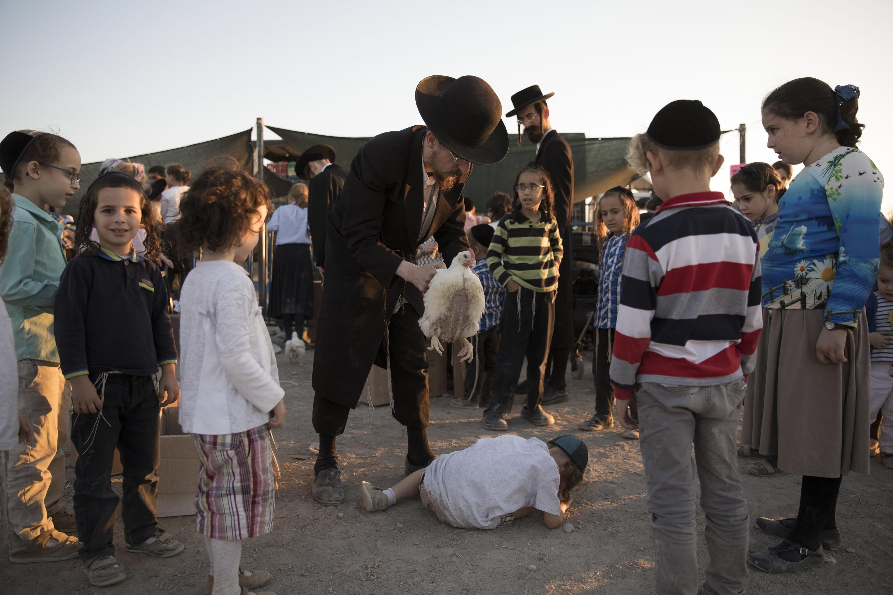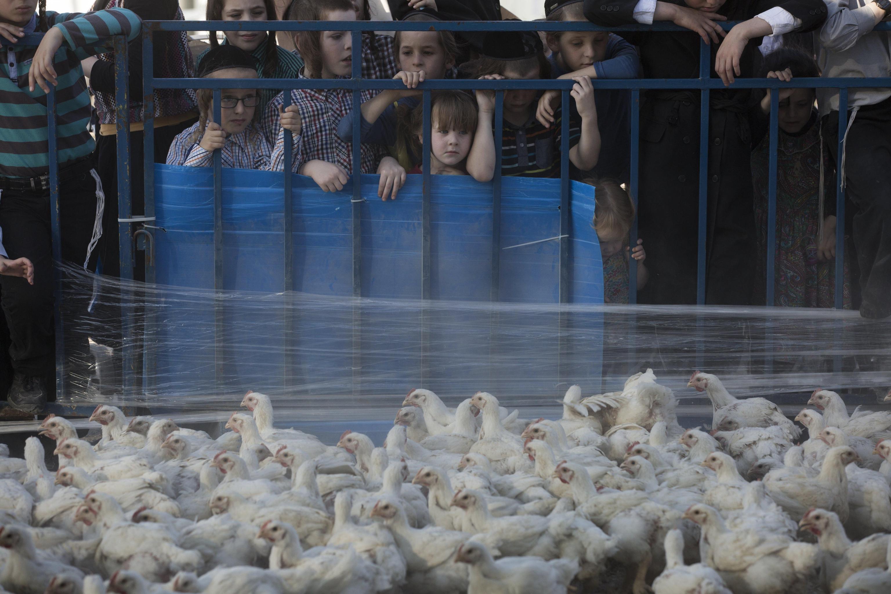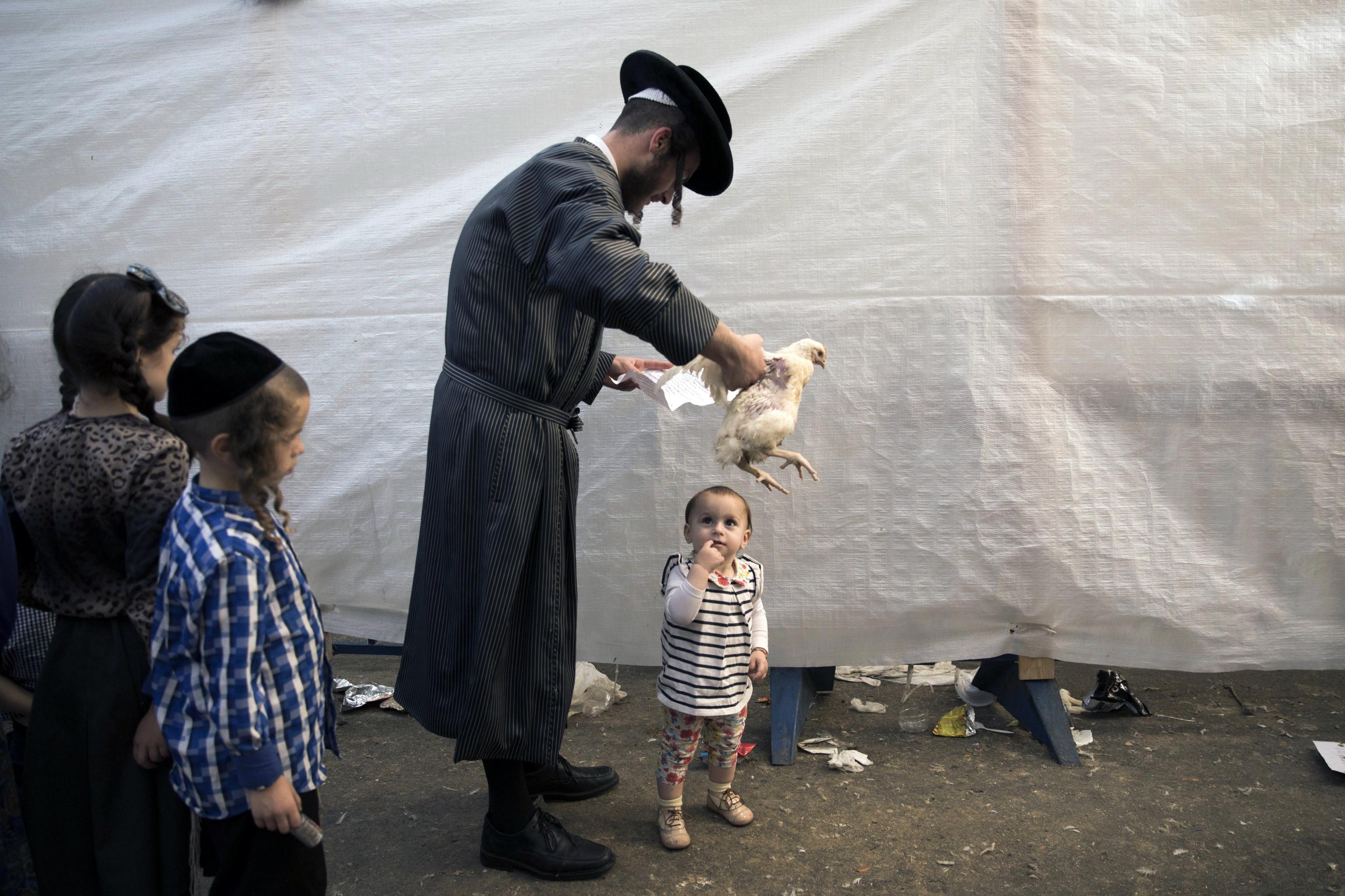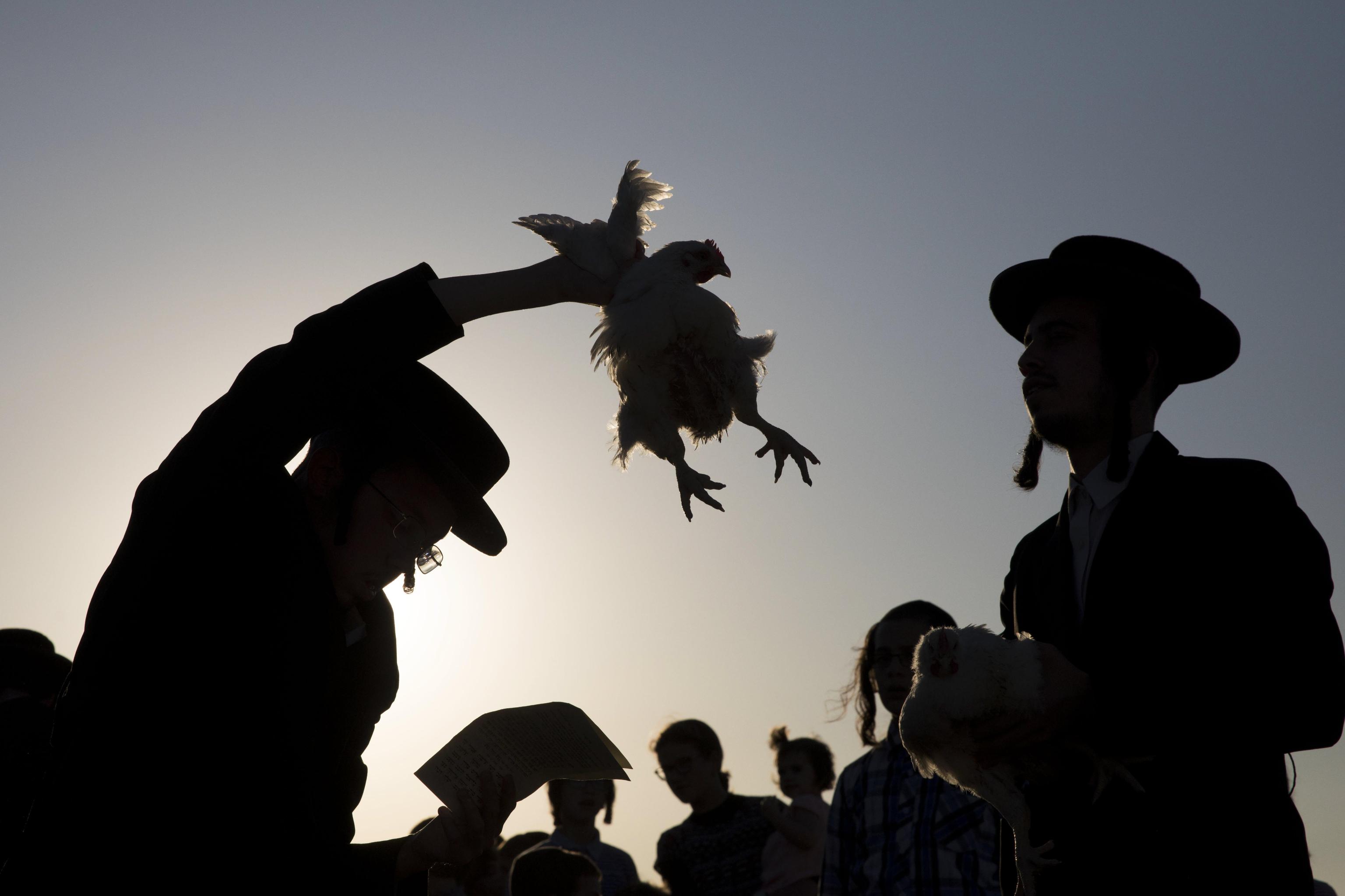 Il giorno ebraico della penitenza, lo Yom Kippur, viene preceduto dal Kaparot, una cerimonia alla vigilia che prevede che sia fatto roteare per tre volte sulla testa di una persona un pollo o una somma di denaro e dopo aver recitato una formula che simbolicamente trasferisce i peccati commessi dalla persona sul denaro o sul pollo, quest’ultimo viene ucciso secondo i dettami della shechità e donato ai poveri, cosa che ovviamente si fa con lo stesso denaro. Data l’efferatezza della macellazione dei polli e il numero dei gallinacei utilizzati e uccisi, sempre di più manifestazioni di animalisti e attivisti influenzano l’opinione pubblica e la scelta di ripiegare sul denaro piuttosto che sugli animali vivi. (foto Ap e Ansa)