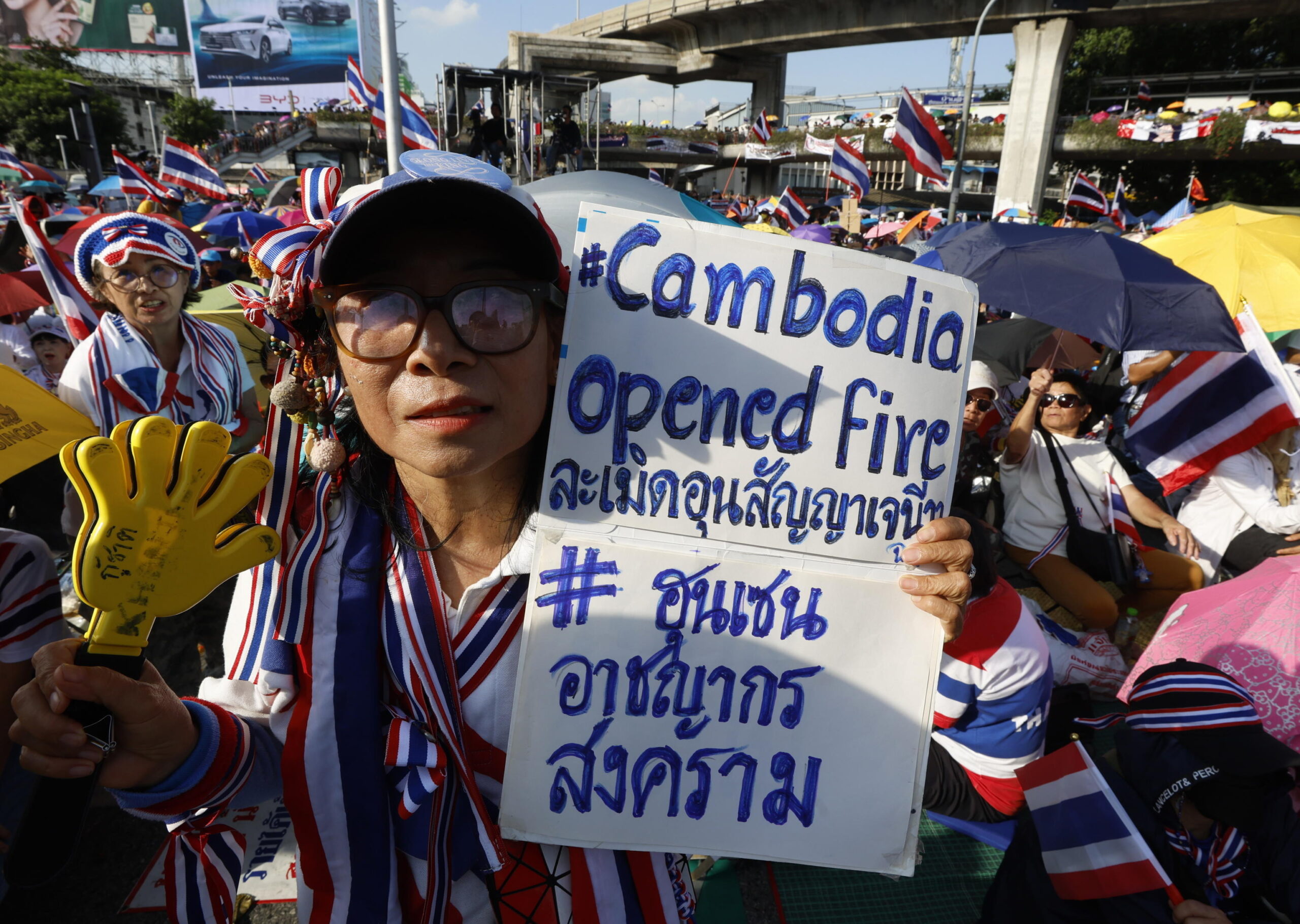 Manifestanti in Thailandia per condannare la guerra con la Cambogia e chiedere le dimissioni del primo ministro, mostrando al contempo sostegno all’esercito thailandese lungo il confine tra Thailandia e Cambogia. EPA/NARONG SANGNAK