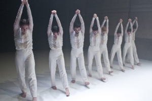 Creazione del 2022, la White room concepita dal ventottenne Adriano Bolognino (Premio Danza&Danza 2022 come “coreografo emergente”, e in piena attività creativa), è una stanza bianca dove rivive, ispirato dall’opera pittorica Il ritorno dal bosco di Giovanni Segantini, l’inverno emozionale di anime inquiete e in attesa. In uno spazio astratto dominato dal bianco anche nei semplici e raffinati costumi di tute unisex e nella brumosa atmosfera che li avvolge, gli 8 bravissimi interpreti della COB Compagnia Opus Ballet (diretta da Rosanna Brocanello) disegnano un paesaggio di corpi trepidanti, dai gesti netti e fluenti, dalle linee continuamente rotte, da una calligrafia pennellata da braccia e gambe stilizzate, da figurazioni geometriche, da palpiti ritmati, posture oscillanti, accelerazioni e fughe.