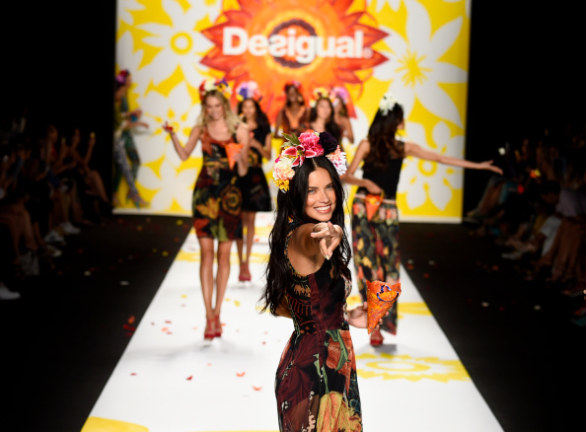 Grande attesa c’è stata anche per Victoria Beckham e per la sua sfilata Desigual, arricchita da disegni e colori estivi, le modelle hanno sfilato con mini abiti dalle sfumature arancio, verde e giallo, gonne rosse, vestiti con frange, camicette che puntano sul vedo e non vedo, zeppe, orecchini ben in vista, grandi e colorati, immancabile la corona di fiori sulla testa di ogni modella.