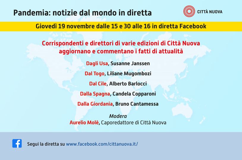 Sono gli argomenti di cui parliamo giovedì 19 novembre dalle 15 e 30 alle 16 in diretta Facebook con Susanne Janssen, direttore di Living City, Liliane Mugombozi, corrispondente dal Togo, Candela Copparoni, corrispondente dalla Spagna, Alberto Barlocci, corrispondente dal Cile, Bruno Cantamessa, corrispondente dalla Giordania.