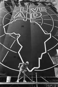 Un operaio stende lavora in preparazione del concerto Live Aid di sabato 12 luglio 1985 a Filadelfia, Pa. Dietro di lui il logo della campagna. (AP Photo/Rusty Kennedy)