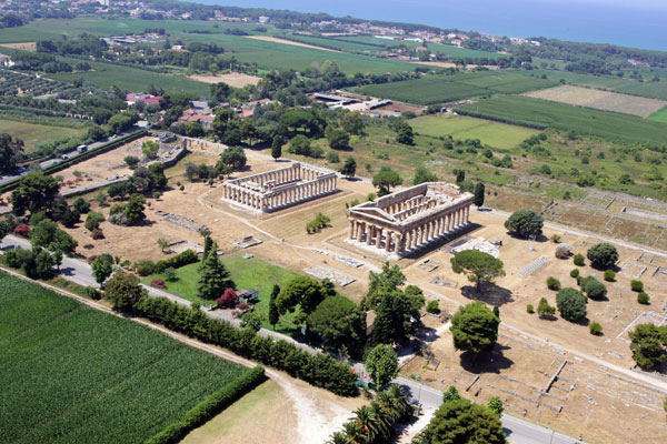 Paestum, la Poseidonia fondata dai Sibariti, la Grecia a due passi da casa. Unica per più motivi: sola città greca il cui perimetro murale sia interamente conservato, possiede testimonianze insigni delle tre forme d’arte greca giunte fino a noi: l’architettura, rappresentata dai templi dorici, di cui quello di Nettuno per maestosità, equilibrio di forme e armonia di linee rivaleggia con lo stesso Partenone; la scultura, con gli elegantissimi rilievi arcaici del suo santuario alle foci del Sele; e infine la pittura, esemplata in quella Tomba del Tuffatore – unico affresco greco esistente – la cui svelta figurina nuda che si slancia da un alto pilastro sembra simboleggiare l’anelito dell’anima a varcare i confini dell’aldilà. E se non bastasse, a tutto ciò si aggiunga la splendida collezione di pitture funebri lucane, espressione del fiero popolo italico che per circa 140 anni soggiogò i posidoniati, rimanendo peraltro soggiogato dalla loro superiore civiltà, per poi cedere a sua volta ai conquistatori romani.