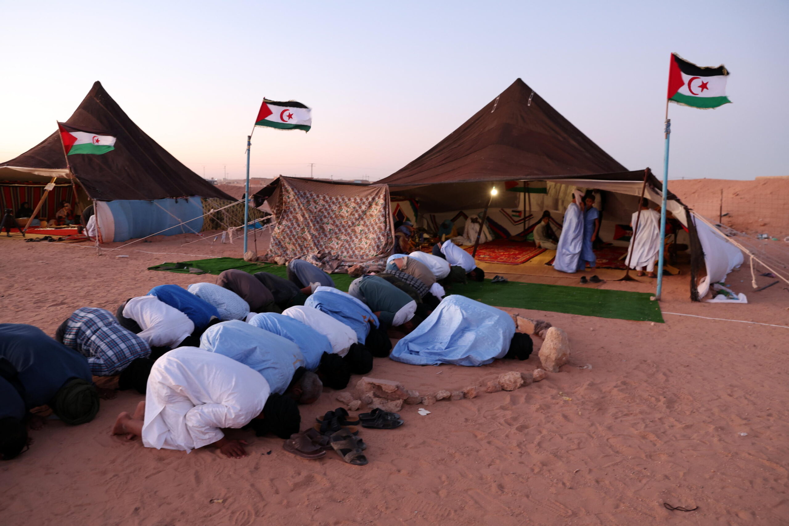 Fedeli sahrawi pregano durante le celebrazioni del 50° anniversario della Repubblica Sahrawi ad Aousserd (Algeria), proclamata nel 1976 dal Fronte Polisario dopo il ritiro spagnolo, simbolo dell’identità e della richiesta di indipendenza. Credit: ANSA/EPA/Mohamed Messara.