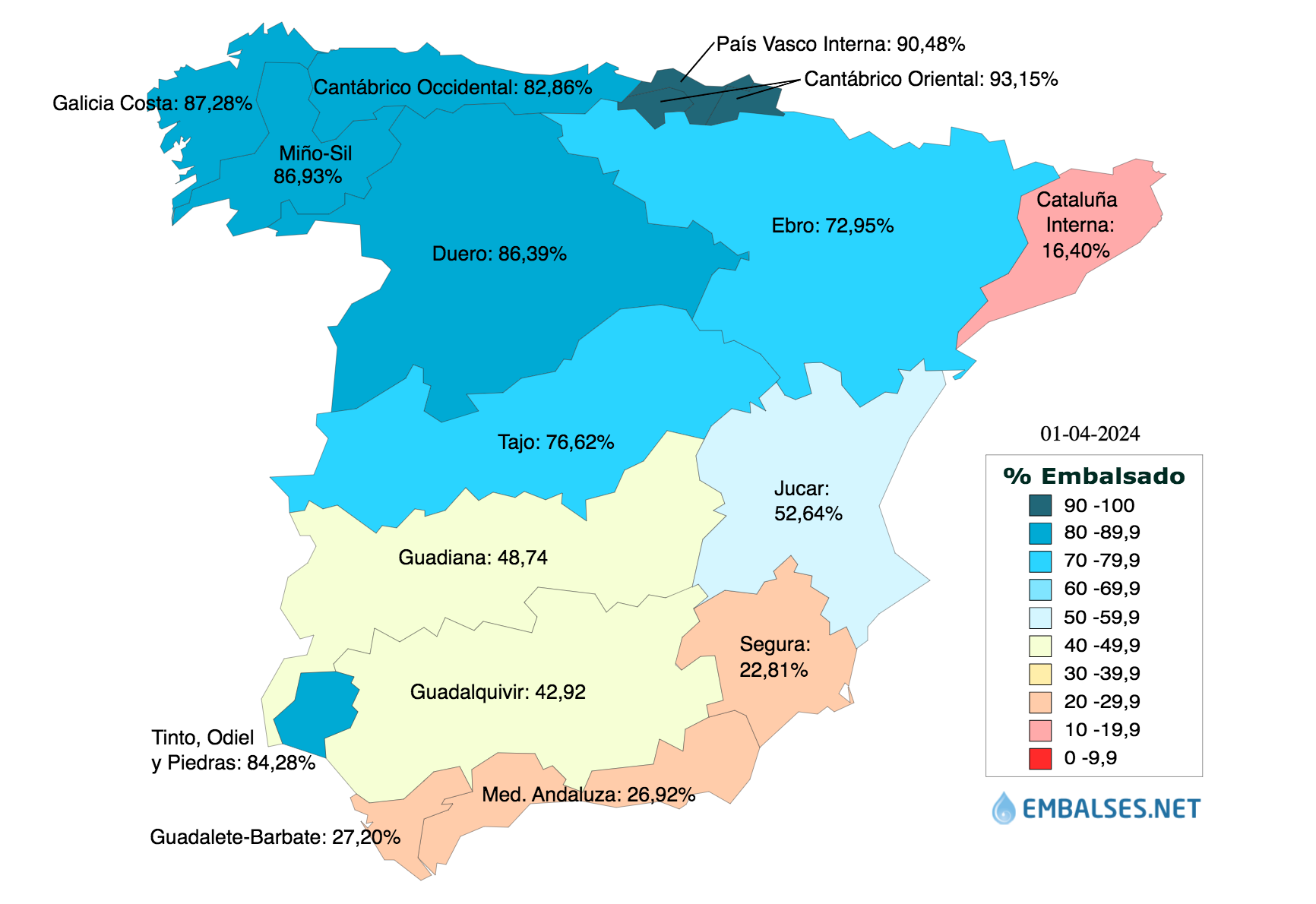 La mappa mostra la percentuale d’acqua immagazzinata (embalsado) nei bacini idrici spagnoli, regione per regione, rispetto alla capacità complessiva di riempimento degli invasi.
