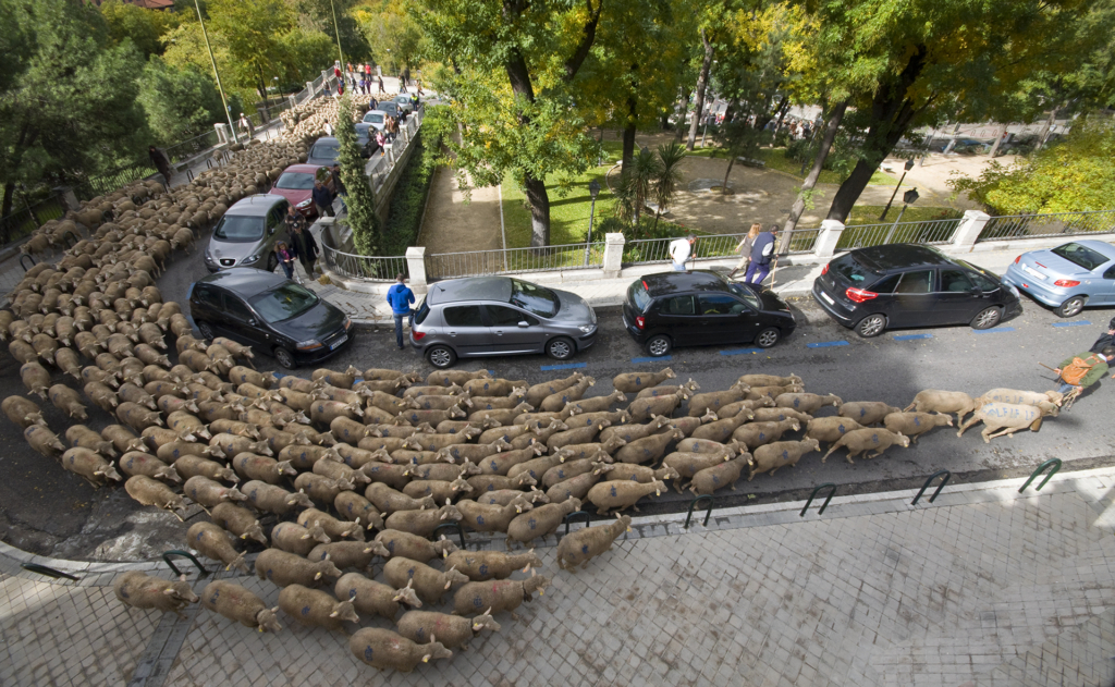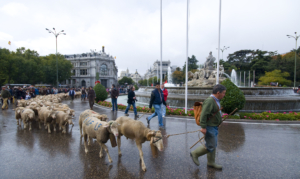 All’inizio dell’autunno si svolge a Madrid, dal 1994, la Festa della transumanza. Quest’anno si è tenuta domenica 23 ottobre. Un grosso gregge di quasi 1.500 capi di bestiame, composto da pecore e capre, percorre le vie della città fino alla piazza del Comune (Plaza de Cibeles) e lì, simbolicamente, i pastori pagano al sindaco 50 maravedì (moneta medioevale) per ogni mille capi, come concordato nel 1418 tra la gilda dei pastori e il consiglio comunale. Era la tassa stabilita a quei tempi per consentire al bestiame di utilizzare le strade del municipio. Oggi la festa ha un significato piuttosto folcloristico e turistico, ma nel 1994 ebbe i toni di una vera e propria protesta: gli allevatori volevano rivendicare l’uso di percorsi e sentieri tradizionalmente praticati dal bestiame durante la transumanza. Ed ebbero successo: un anno dopo fu approvata una legge per proteggere e garantire la continuità d’uso dei percorsi del bestiame.