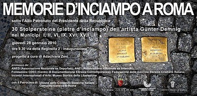 L’Amicizia Ebraico Cristiana di Napoli, in occasione del compimento dei novant’anni di Alberta Levi Temin, decana della Comunità ebraica di Napoli, insignita di numerosi premi e attestati per la sua infaticabile opera in favore della pace e del dialogo, in particolare fra le giovani generazioni, ha deciso di intraprendere un’iniziativa che da un lato potesse attestare l’affetto di quanti la conoscono, e dall’altro potesse radicarsi nel cuore della sua esistenza. Nel concreto e basandosi su di una esperienza fatta precedentemente da una socia dell’associazione, Miriam Rebhum, si è pensato di far venire in Italia l’artista tedesco Gunter Demmin per far installare, per la prima volta nel nostro paese, delle pietre d’inciampo, Stolpersteine in tedesco.