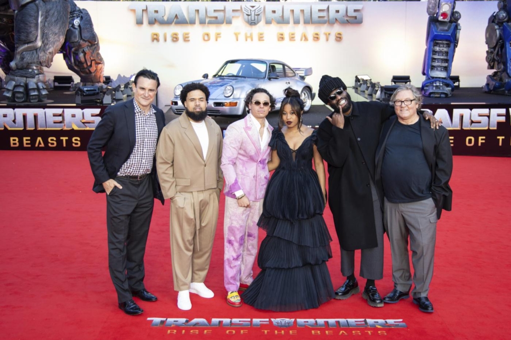 Mark Vahradian, da sinistra, Humza Arshad, Anthony Ramos, Dominique Fishback, Tobe Nwigwe e Lorenzo di Bonaventura alla premiere del film “Transformers: Il risveglio” a Londra, mercoledì 7 giugno, 2023. (Foto di Vianney Le Caer/Invision/AP)
