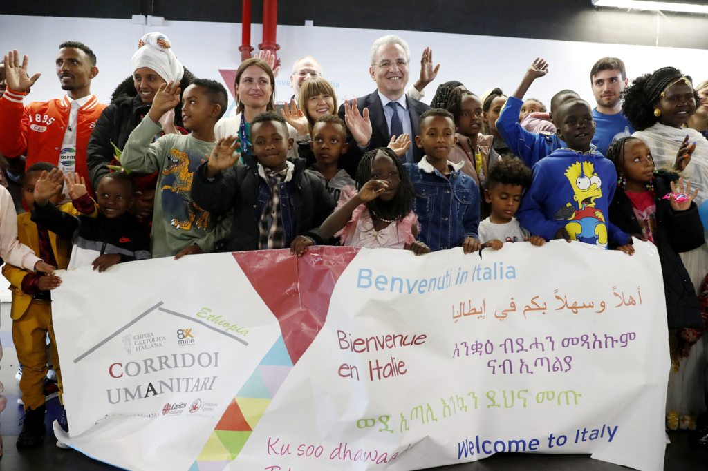 26-04- 2023 Aeroporto di Fiumicino, corridoi umanitari organizzati dalla comunità di Sant’Egidio per l’arrivo di 67 rifugiati provenienti dal Corno d’Africa (Foto Cecilia Fabiano /LaPresse)