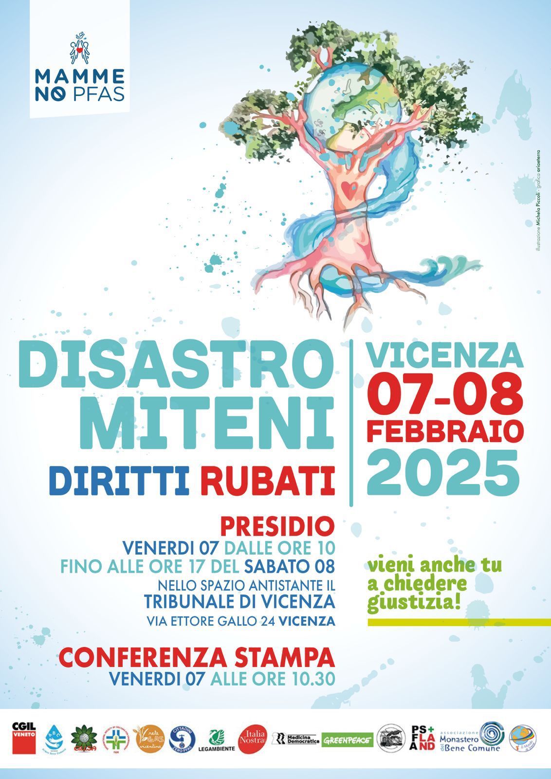 Oltre 24 ore – dalle 10 di venerdì 7 febbraio alle 17 di sabato 8 – davanti al tribunale di Vicenza per chiedere, una volta di più, giustizia: è questo l’intento del presidio promosso dalle Mamme No Pfas, e a cui hanno aderito numerose associazioni (tra cui Legambiente, Greenpeace, Italia Nostra) e sindacati. L’occasione è un nuovo passaggio (la requisitoria dei pubblici ministeri) del procedimento giudiziario, che si avvia ormai verso la fine, che vede implicati 18 manager dell’ex Miteni e delle aziende che si sono poi succedute; e che vuole appurare, dopo decenni, le responsabilità relative all’inquinamento da Pfas delle acque di una vasta area tra le province di Vicenza, Padova e Verona. Hanno annunciato la loro presenza nel corso delle due giornate diversi sindaci della zona e anche il vescovo di Vicenza, mons. Giuliano Brugnotto.