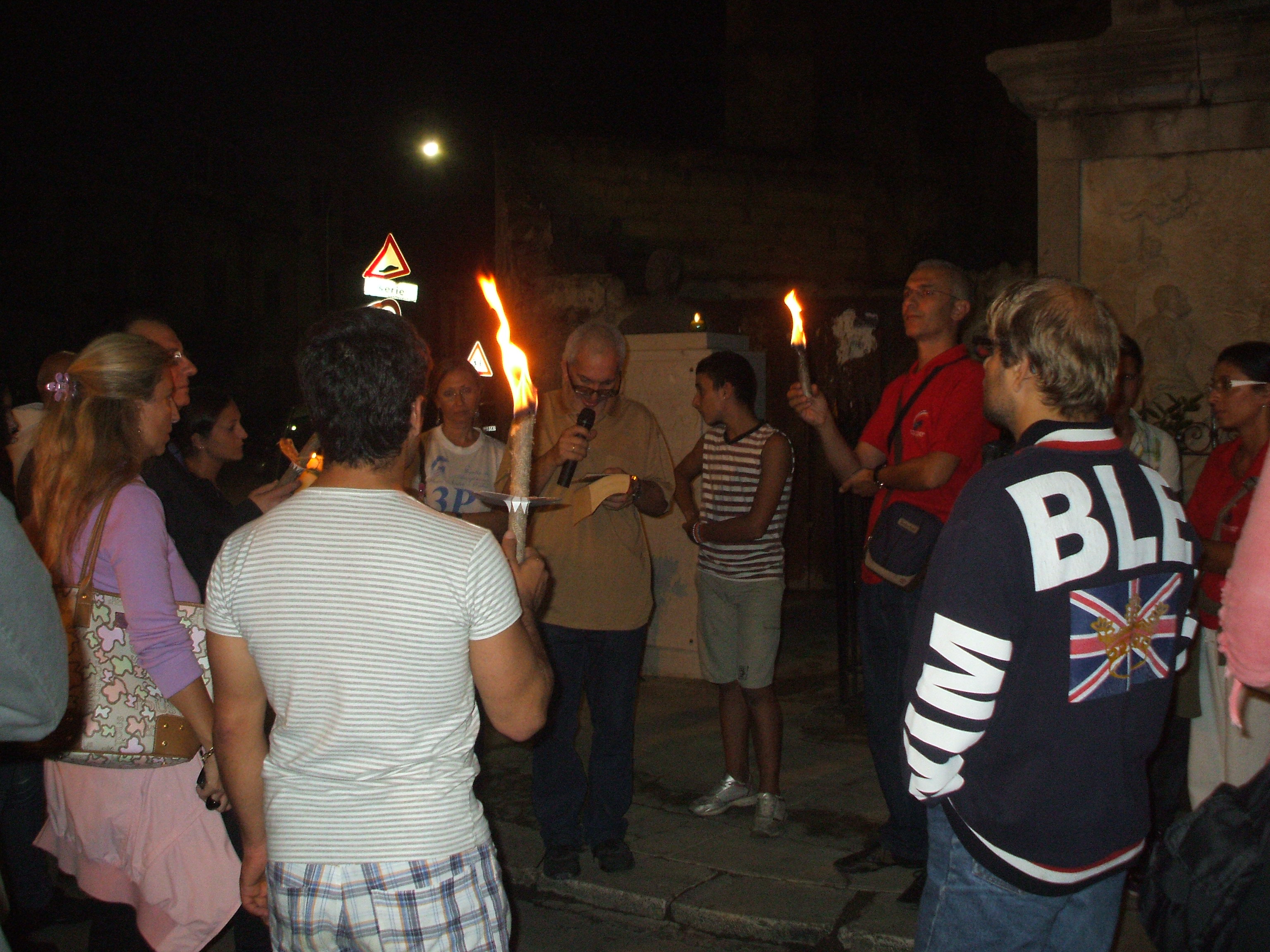 Piccoli lumini posti sui marciapiedi illuminano la notte di Brancaccio, quartiere periferico di Palermo. Sulla strada tante fiaccole accese e poi tanti bambini. Erano circa trecento ieri sera i presenti alla fiaccolata in memoria di padre Pino Puglisi, il sacerdote ucciso dalla mafia il 15 settembre 1993, proprio nel giorno del suo compleanno. Finché non sorga come stella la sua giustizia è stato il tema della riflessione animata da scritti di don Puglisi durante le soste in alcuni luoghi degradati della zona.
