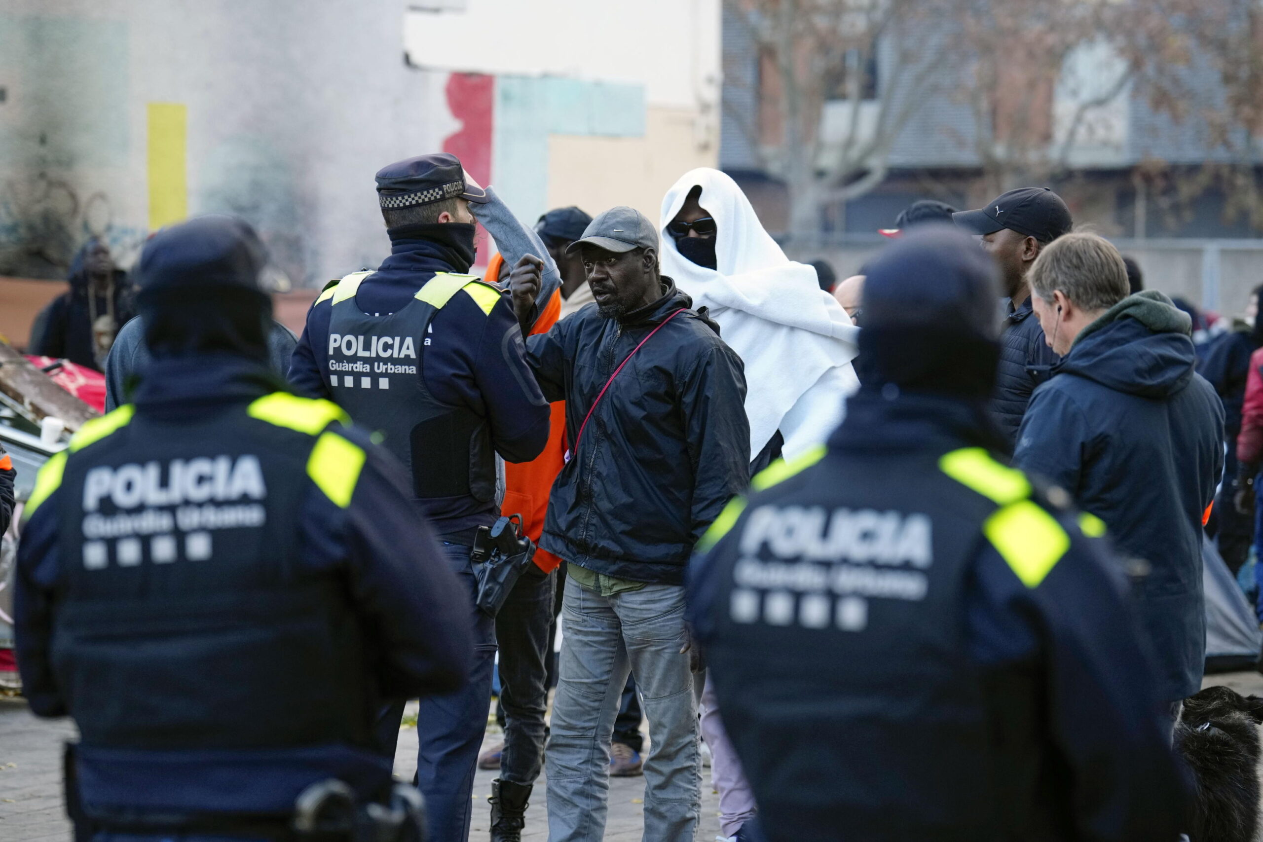 Agenti della polizia locale allontanano alcuni migranti da una piazza a Badalona (Barcellona), il 19 dicembre 2025. Circa 50 persone avevano passato due notti all’aperto dopo lo sgombero da un edificio abbandonato. Credit: EPA/ Alejandro Garcia.