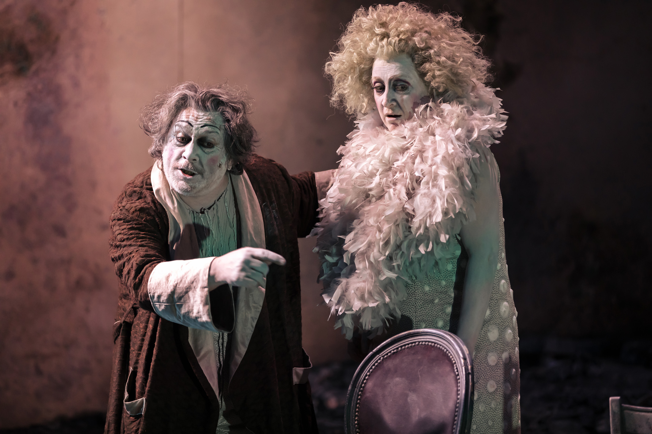 C’è, nell’allestimento di Binasco, una ricchezza di dettagli sparsi ovunque: sulla scena come nelle luci e nelle musiche – da una canzone francese a una popolare, dai rumori a sonorità sospese, a quelli di una chitarra elettrica immaginata dal vegliardo col suo bastone ‒, ma soprattutto nei protagonisti mirabilmente invecchiati, Federica Fracassi e Michele Di Mauro, coppia perfetta, struggenti e poetici, goffi e maniacali nel loro muoversi strascicato, nelle battute puntigliose o biascicate, nelle espressioni mimiche evidenziate dai volti di biacca. In questa farsa metafisica, parodia della commedia umana, il regista spruzza sulle due figure certa polvere beckettiana, imprimendo nel ritmo, tra sarcasmo e angoscia, una comicità malinconica, vibrante di tenera umanità. E fa di questo testo, tra i più emblematici del “teatro dell’assurdo” di Ionesco, una grande storia d’amore. Va segnalato che con questo spettacolo Federica Fracassi ha ricevuto il premio “Le maschere del teatro italiano” 2021 come miglior attrice protagonista, e Nicolas Bovey il Premio Ubu 2020-2021 per la miglior scenografia.