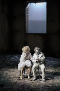 C’è, nell’allestimento di Binasco, una ricchezza di dettagli sparsi ovunque: sulla scena come nelle luci e nelle musiche – da una canzone francese a una popolare, dai rumori a sonorità sospese, a quelli di una chitarra elettrica immaginata dal vegliardo col suo bastone ‒, ma soprattutto nei protagonisti mirabilmente invecchiati, Federica Fracassi e Michele Di Mauro, coppia perfetta, struggenti e poetici, goffi e maniacali nel loro muoversi strascicato, nelle battute puntigliose o biascicate, nelle espressioni mimiche evidenziate dai volti di biacca. In questa farsa metafisica, parodia della commedia umana, il regista spruzza sulle due figure certa polvere beckettiana, imprimendo nel ritmo, tra sarcasmo e angoscia, una comicità malinconica, vibrante di tenera umanità. E fa di questo testo, tra i più emblematici del “teatro dell’assurdo” di Ionesco, una grande storia d’amore. Va segnalato che con questo spettacolo Federica Fracassi ha ricevuto il premio “Le maschere del teatro italiano” 2021 come miglior attrice protagonista, e Nicolas Bovey il Premio Ubu 2020-2021 per la miglior scenografia.