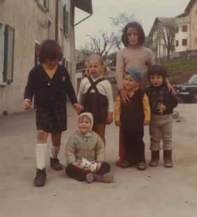 Raffaella, seduta a terra, attorno ai cugini adottivi nel cortile di casa a Folgaria.