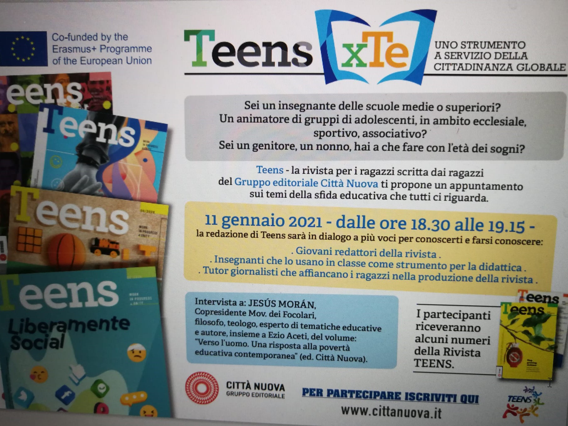 Un appuntamento da non perdere, dunque, per quanti hanno a cuore le nuove generazioni, quello di cui stiamo parlando: Teens lunedì 11 gennaio alle ore 18.30 propone un appuntamento per dialogare sui temi della sfida educativa che riguarda tutti. Interverranno gli adolescenti redattori della rivista, insegnanti che lo utilizzano in classe a supporto della didattica, giornalisti che affiancano i ragazzi. Jesús Morán, copresidente del Movimento dei Focolari, filosofo, teologo, esperto di tematiche educative, autore con Ezio Aceti del libro “Verso l’uomo” (ed. Città Nuova), offrirà spunti di riflessione assolutamente inediti. L’evento è libero e dedicato agli insegnanti delle scuole medie o superiori, ai genitori, agli animatori di gruppi di adolescenti in ambito ecclesiale, associativo o sportivo. Potrà essere seguito sul canale YouTube e sulla pagina Facebook di Città Nuova.