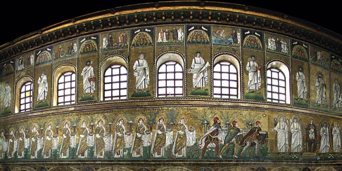 È onnipresente, in questa città sorta in luoghi paludosi a pochi chilometri dalla costa adriatica, il tema acquatico: appare nei mosaici (vasi e pozze a cui si dissetano colombe, pavoni e altri volatili, oppure cervi: altrettanti simboli dell’anima che anela a Dio) e perfino nelle venature dei marmi delle antiche basiliche che sembrano suggerire il moto ondoso. Lo stesso mausoleo di Galla Placidia con la sua penombra azzurro-verde riserva al visitatore atmosfere da acquario. E acque reali, causa il lento e progressivo abbassamento del suolo, inondano le cripte di certe chiese con tanto di pesciolini rossi guizzanti sui mosaici pavimentali.