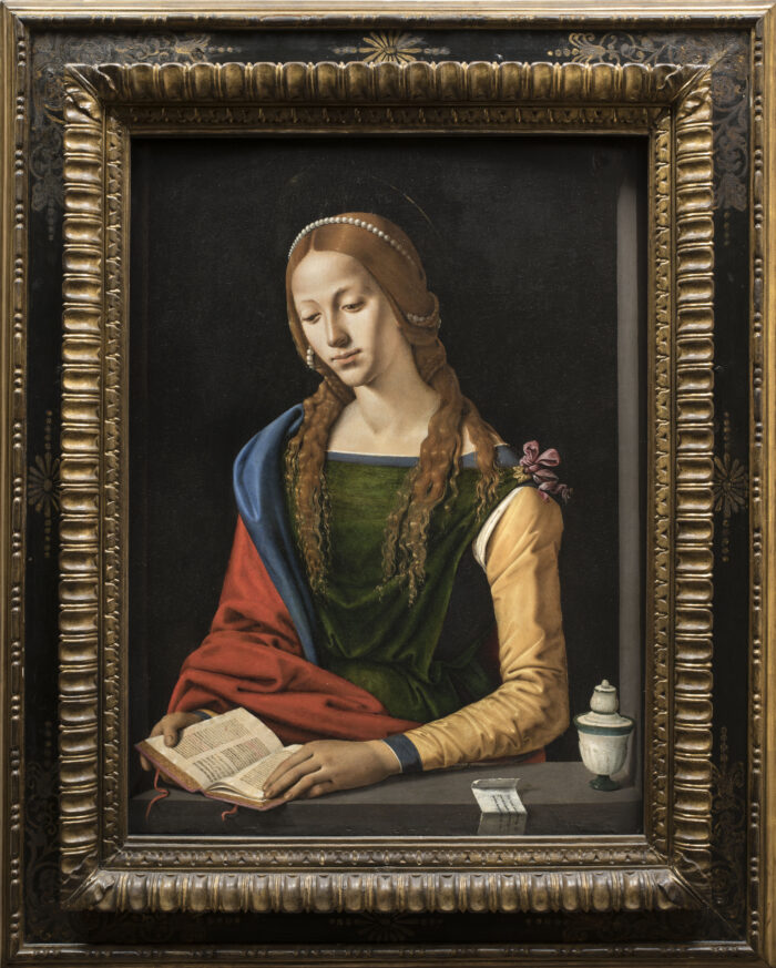 La santa seguace di Gesù, confusa all’epoca con la peccatrice che gli ungeva di profumo i piedi, è rappresentata con il vasetto di unguenti, emergente dal fondo scuro di uso fiammingo, ben presente a Firenze, nella tavola dipinta per la devozione privata. È una bellezza fiorentina dell’epoca, forse un ritratto, calma, appoggiata ad una finestra, i capelli chiari intrecciati con perle e sciolti, gli abiti in blu, rosso, verde e giallo: sta serena a leggere una Bibbia di tradizione francese. Assorta, il volto modellato da ombre luminose. I colori sono vivi ma non vivaci in una immagine di signorilità tranquilla, con l’originalità di un foglietto scritto a mano pendente sul davanzale.