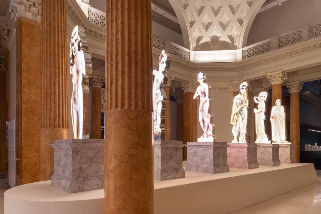 Il percorso espositivo si sussegue tranquillo tra spezzoni di film – fra cui Il Gladiatore e il Satyricon felliniano, Spartacus, Caligula, Cleopatra e così via –, reperti archeologici conservati nelle diverse sedi del Museo Nazionale Romano e opere dello stesso Vezzoli che incorporano elementi d’arte antica – come il volto del celebre Antinoo – o che dall’arte classica sono ispirate. Dialogano fra loro materiali ed epoche con il desiderio – grazie all’allestimento teatrale ed immersivo di Filippo Bisagni – di un racconto nuovo che ridia all’arte classica la sua vitalità, intesa non solo come divertimento ed evasione ma anche come memento mori. Si dimostra così che l’animo umano è sempre lo stesso col passare dei secoli: desiderio di rimanere e paura di non esserci più.