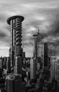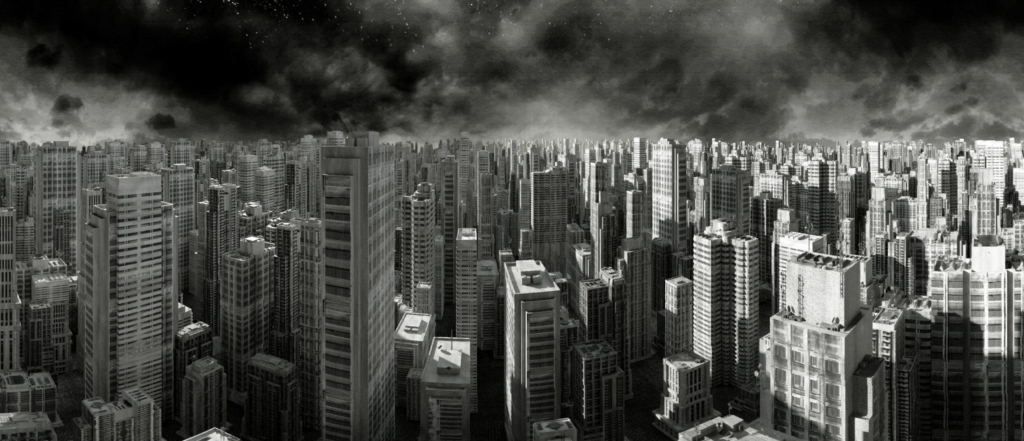 Sui muri sono proiettate sette grandi tele che riproducono, avvolgendoci, i paesaggi urbani di Fabio Giampietro, vertiginose megalopoli viste dall’alto, mondi in bilico tra illusioni ottiche e giochi geometrici. Lungo il percorso espositivo veniamo accompagnati dalla voce di una misteriosa guida che ci inviterà a raccoglierci al centro della sala per abbracciare in uno sguardo più ampio le intere immagini.