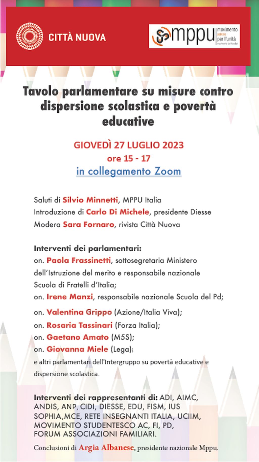 Su impulso di Città Nuova, del Mppu e di una vasta rete di associazioni professionali di docenti, dirigenti, studenti e famiglie, si è costituito formalmente l’Intergruppo parlamentare per contrastare la dispersione scolastica e le povertà educative. Giovedì 27 luglio ci sarà un incontro in collegamento per fare il punto, con questi parlamentari e con i presidenti delle associazioni, sulla produzione normativa approvata in questi mesi ed in corso dopo il Tavolo parlamentare del 23 marzo alla Camera dei Deputati.