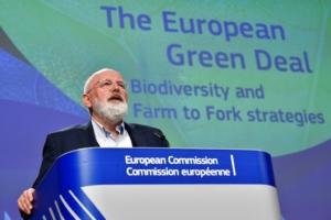 Il commissario europeo per l’European Green Deal Frans Timmermans durante una conferenza stampa presso la sede dell’UE a Bruxelles, mercoledì 20 maggio 2020. (John Thys, Pool Photo via AP)