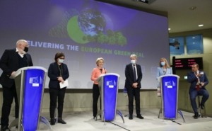 Il presidente della Commissione europea Ursula von der Leyen, al centro, durante una conferenza stampa nella sede dell’UE a Bruxelles, mercoledì 14 luglio 2021. Da sinistra, il commissario europeo per il Green Deal Frans Timmermans, il commissario europeo per i Trasporti Adina Valean, il commissario europeo per l’Economia Paolo Gentiloni, il commissario europeo per l’Energia Kadri Simson e il commissario europeo per l’Ambiente e gli Oceani Virginijus Sinkevicius. (AP Photo/Valeria Mongelli)