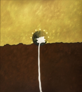 Ecco allora l’artista guardarsi “dentro” nella verità in quell’olio su carta così denso “L’albero narciso” (2006), inquietante ed inquieto per poi attingere nelle ultime opere a una stupenda variazione sinfonica di colori e di forme non più “tattili”, ma “spirituali”, di cavalieri che volano sui numeri (2013), del rosso-blu Grido di dolore (2015) e di quella tela tanto fosforescente ed alta quale è L’albero dalle nove stelle (2013). Un fusto candido che “buca” il cosmo stellato entro cui si innalza il Sole della vita in-finita. C’è una commovente poesia dell’anima: De Romanis dice la sua e nostra mai sazia voglia di cielo, la corsa per trovare l’”Uno”, il punto di convergenza della vita, ossia la luce irradiante di un Essere superiore.