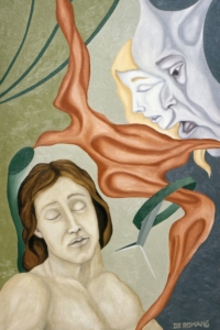 C’è in De Romanis costante un sentimento pure di in-compiutezza. Non nel senso di non-finito o non-finibile, ma di in-soddisfazione, perché la sua ricerca appare tesa a qualcosa di immenso, di troppo grande, perciò il sonno e il sogno diventano in qualche modo “rivelazione”. Nelle Metamorfosi (1987) si fa evidente la dialettica morte-vita, sonno-risveglio con i due corpi “fatti uno” maschile e femminile che trasmettono nascita e fine, abbandono e risveglio nel disegno tornito, “michelangiolesco” e nel colore a vaste spazzolate chiare: come fossimo in una palingenesi di un mondo nuovo.