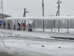 Donne e bambini ucraini in fila alla frontiera verso la Polonia sotto la neve