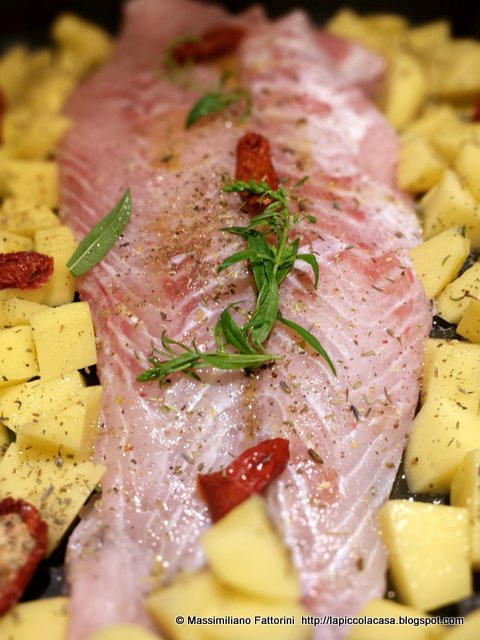 Ecologia Filetto di persico al forno di Max Fattorini Un semplice secondo di pesce al forno con patate, pomodori secchi, timo ed erba …