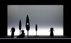 Oggetti simbolici riempiono la scena – una serie di tavoli e di sedie in fila che prenderanno il volo insieme alle tovaglie, una grande barca a vela stilizzata e una in miniatura che vaga sospesa, una macchina da scrivere dal continuo ticchettio, alcuni cipressi, torce elettriche che scandagliano il buio –, mentre un grande uccello e un riccio la attraversano. Il tutto tra folate di musica, blues e sonorità cupe, rumori di vetri infranti che scandiscono il ripetersi delle frasi, stridii, esplosioni improvvise, pioggia scrosciante.