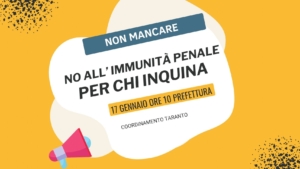 Il mondo delle varie sigle dell’associazionismo tarantino si è ritrovato di nuovo unito nel promuovere il 17 gennaio un presidio in città davanti alla Prefettura per ribadire di ritenere «inaccettabile la proposizione di un modello di produzione definito “green” da realizzarsi tra molti anni, lasciando consapevolmente e colpevolmente per molti anni esposti agli inquinanti la popolazione ed i bambini e gli operai (con conseguenze considerate inaccettabili dalla scienza), prolungando ulteriormente un calvario sanitario che la magistratura ha cercato in tutti i modi di fermare applicando la legge».