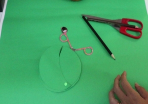 Sovrapponiamo le due sezioni in un punto in basso come a voler simulare un ventaglio e, tenendole ferme in quel punto, appoggiarlo al cerchio di sotto. Fare un buco che attraversi le due sezioni e il cerchio sottostante. All’interno inserire il fermacampione e fissarlo.
